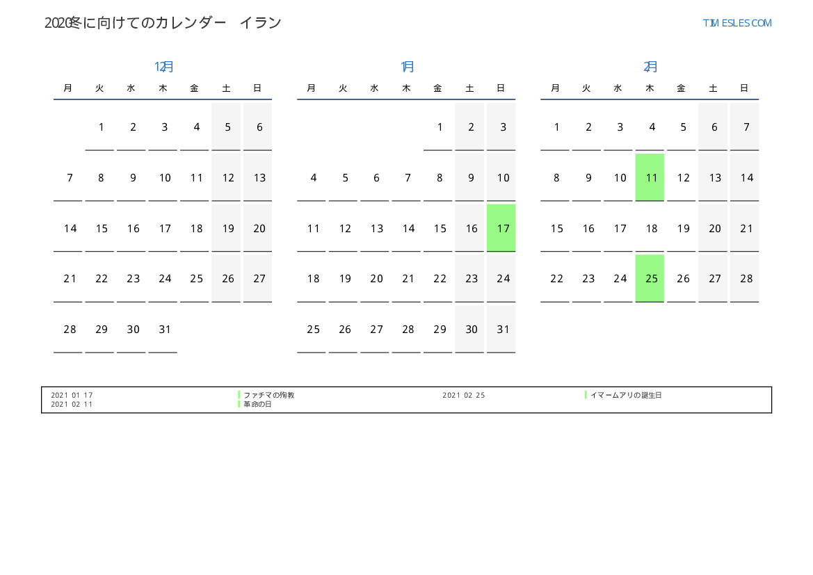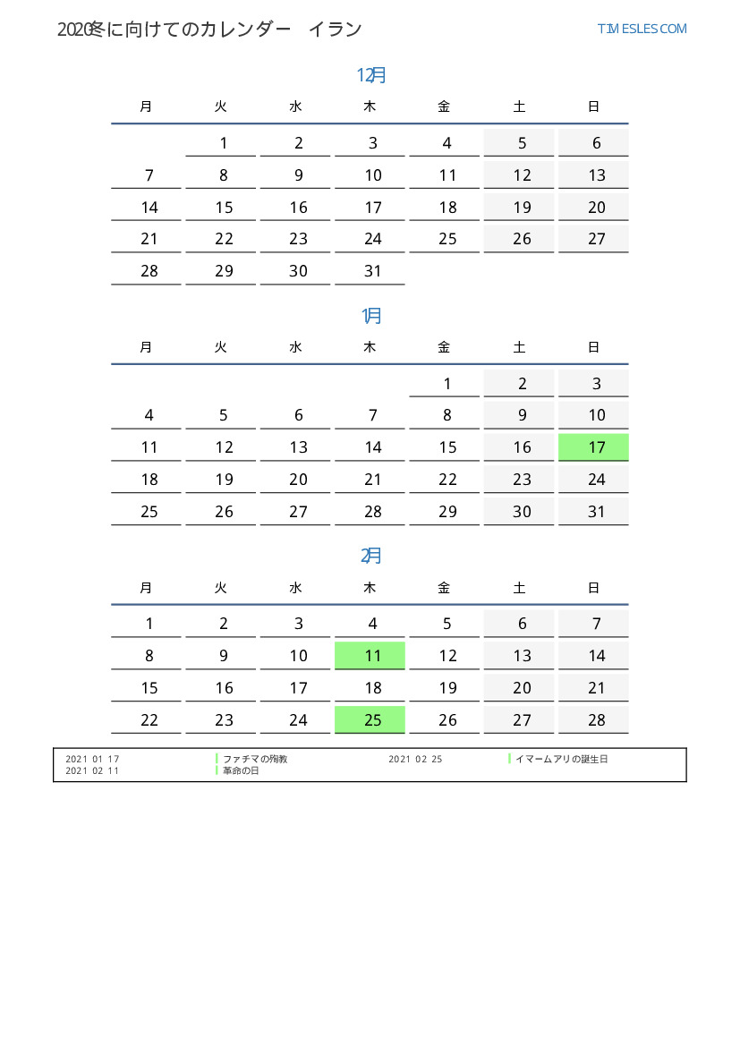 イランのために2021冬に向けての休日と週末のPDFカレンダーをダウンロードして印刷します