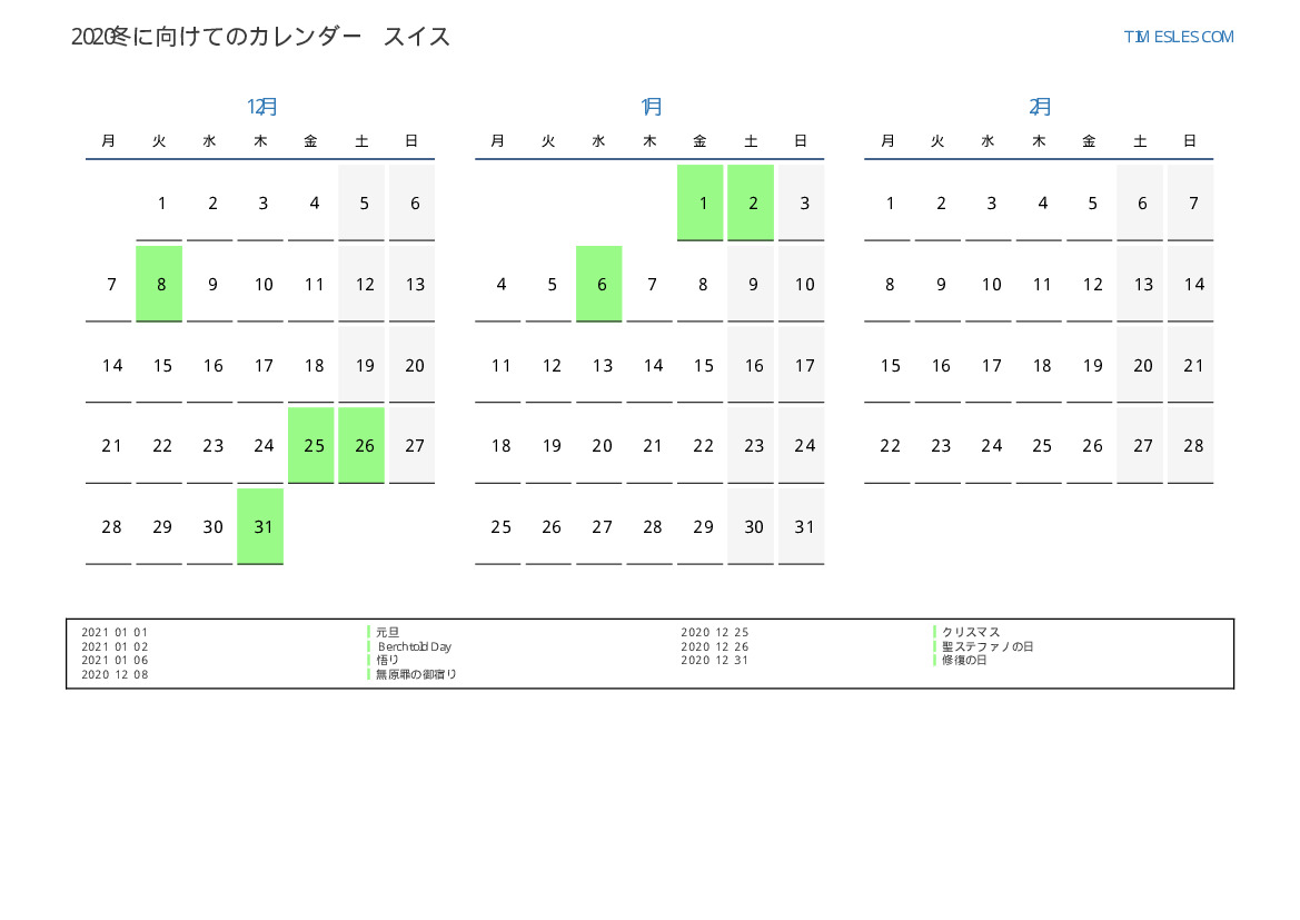 スイス向け2021冬に向けての休日と週末のカレンダー