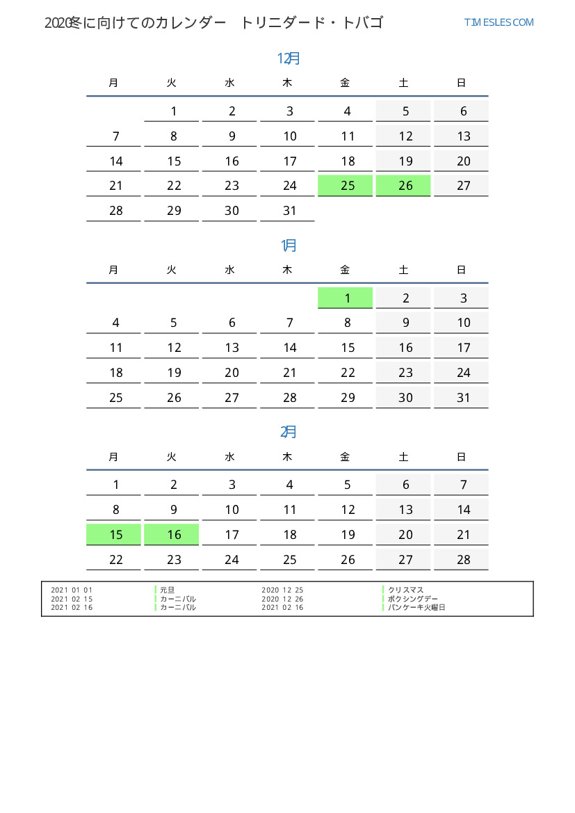トリニダード・トバゴのために2021年冬に向けてのカレンダー