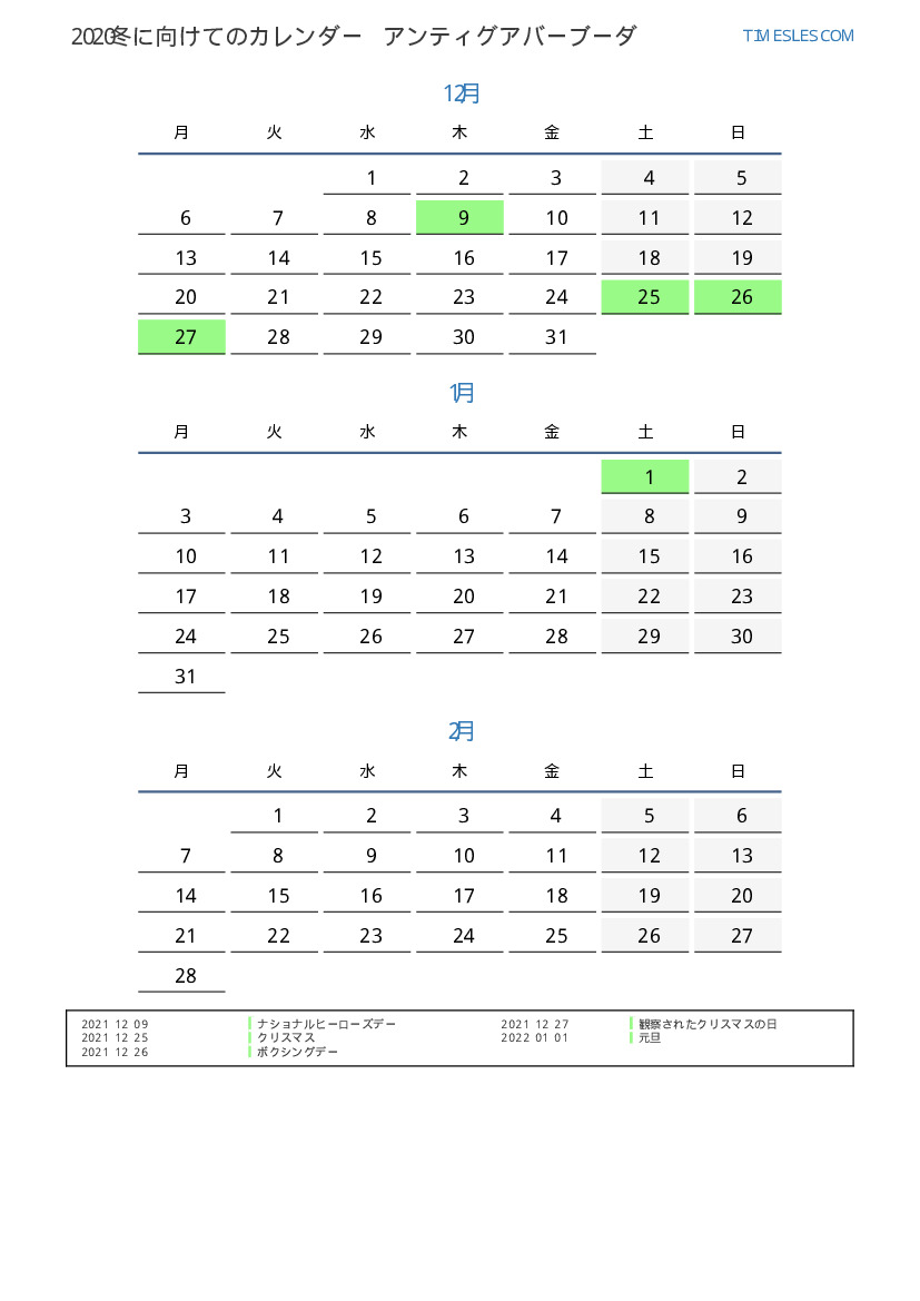 アンティグアバーブーダ2022冬に向けての休日と週末のカレンダー
