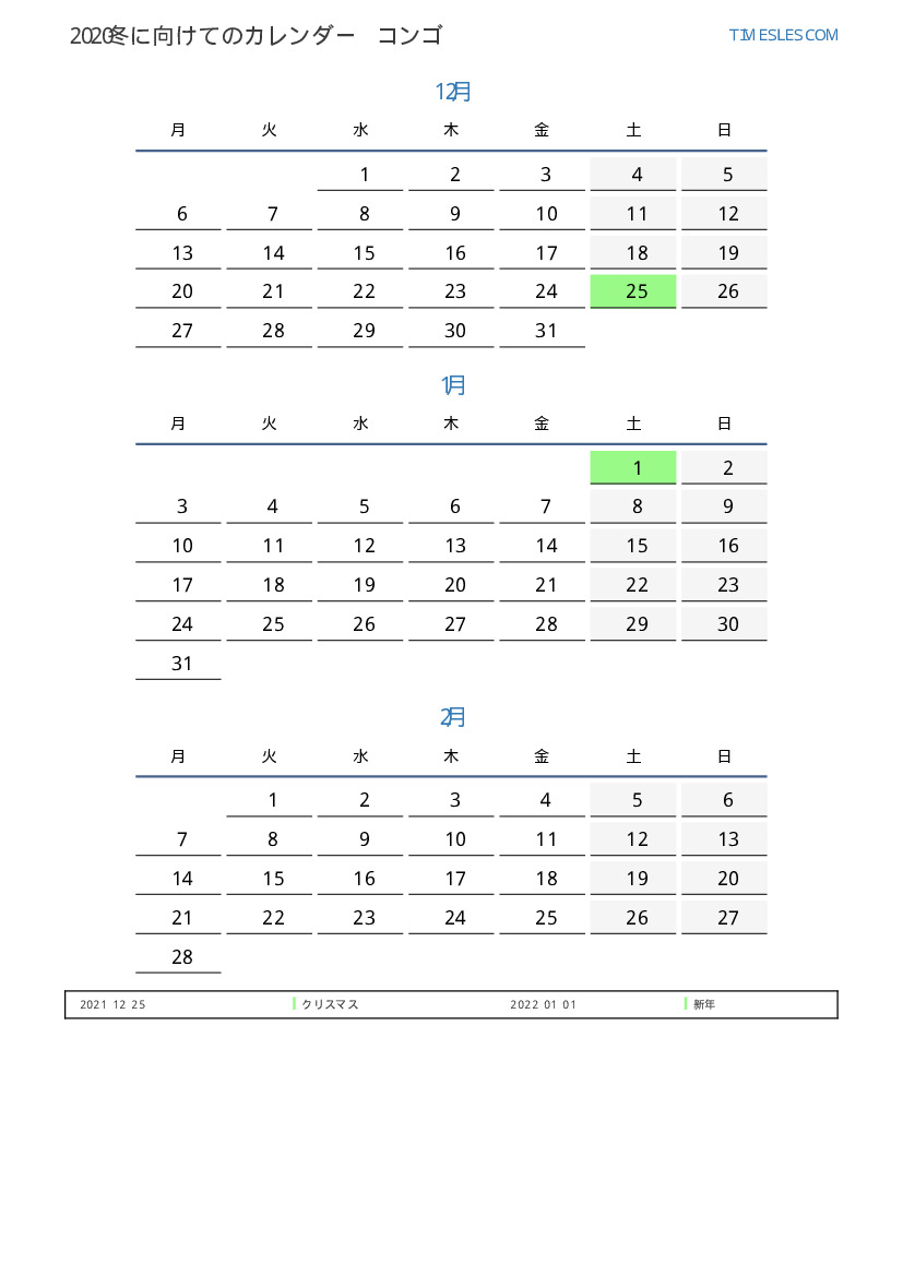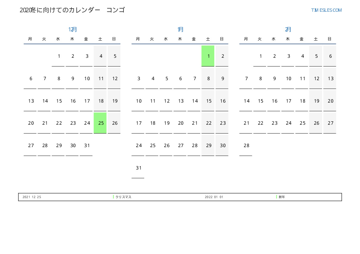 コンゴのために2022冬に向けての休日と週末のPDFカレンダーをダウンロードして印刷します