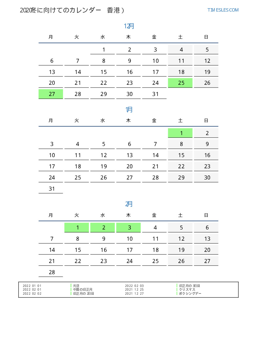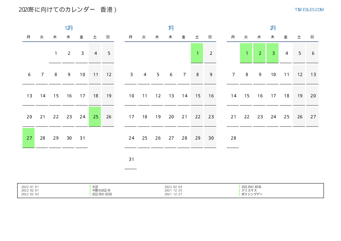 香港向け2022冬に向けての休日と週末のカレンダー