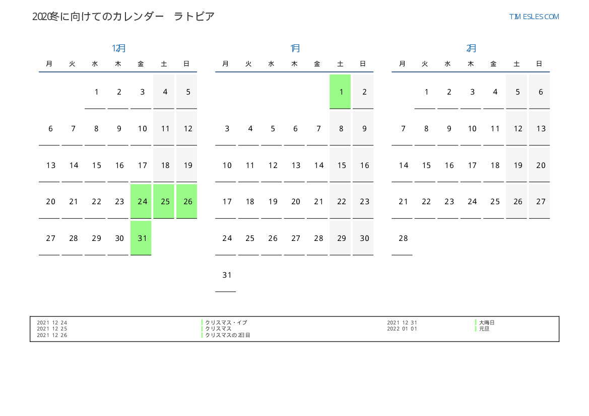 ラトビア向け2022冬に向けての休日と週末のカレンダー