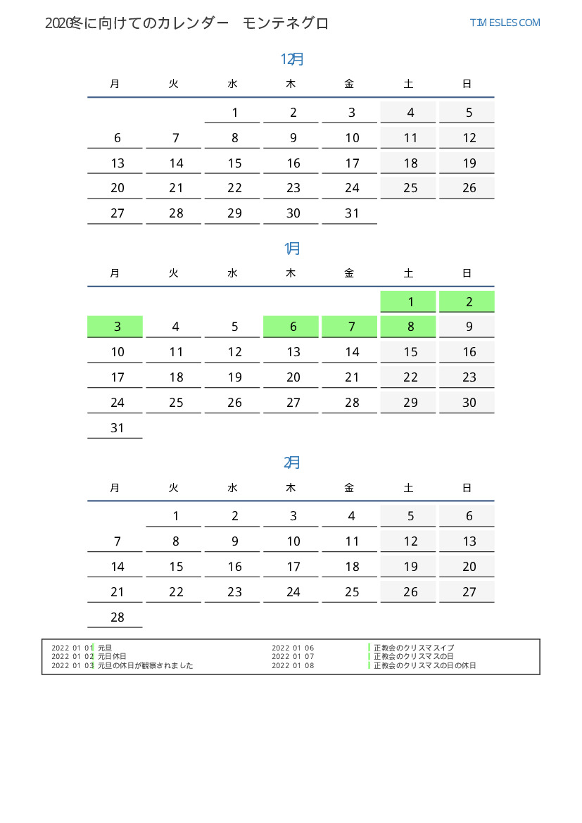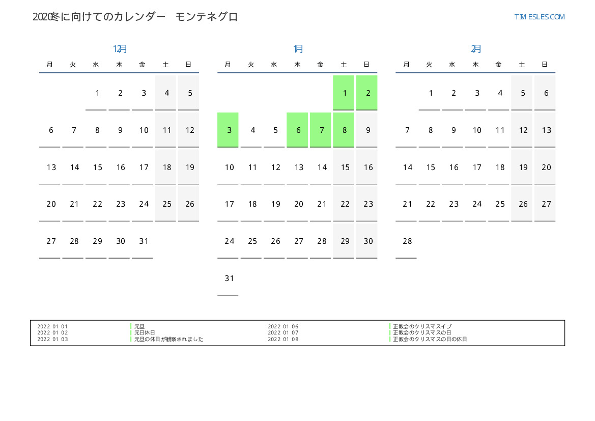 モンテネグロ向け2022冬に向けての休日と週末のカレンダー