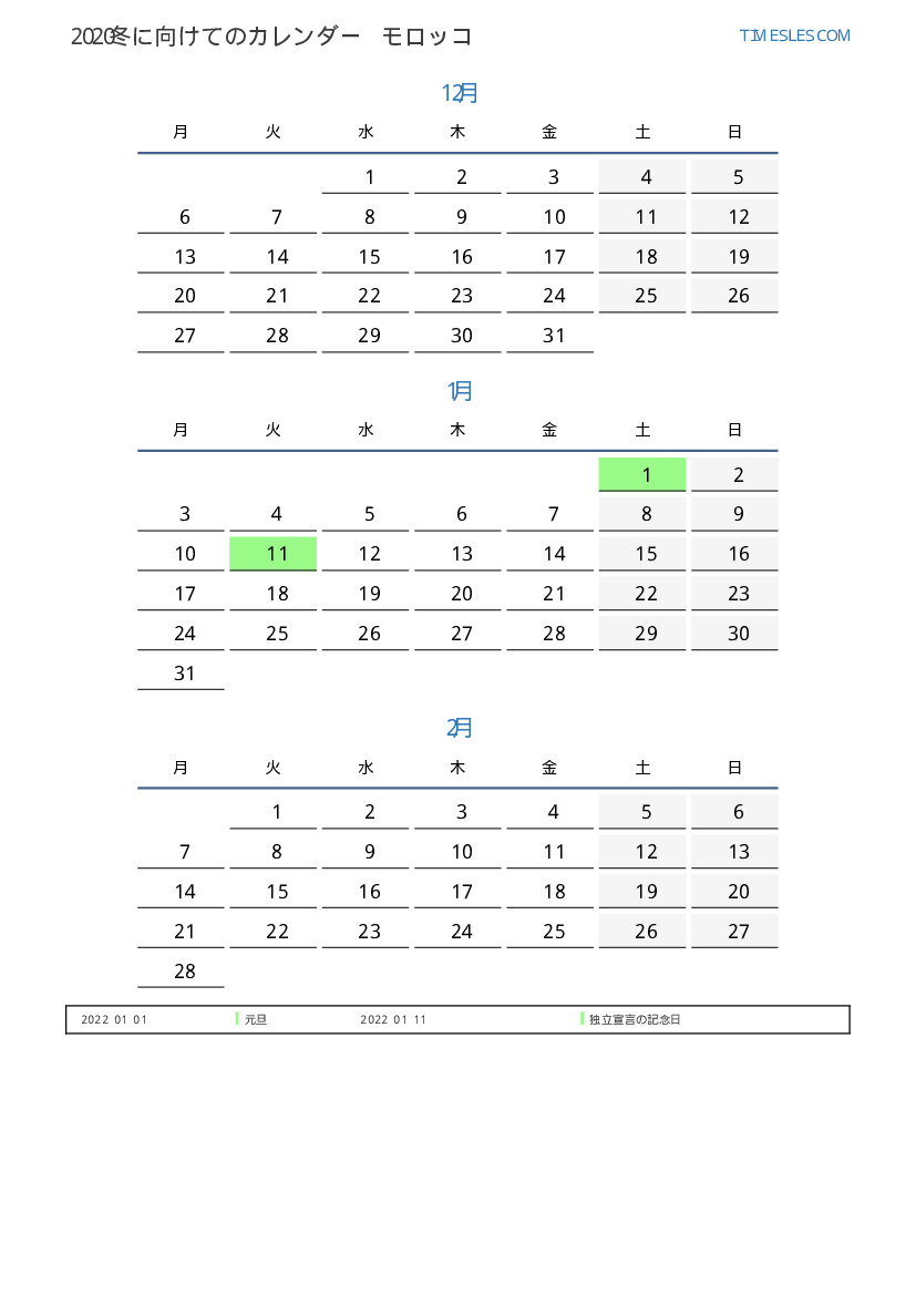 モロッコ向け2022冬に向けての休日と週末のカレンダー