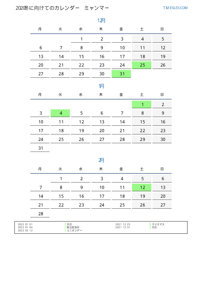 ミャンマー向け2022冬に向けての休日と週末のカレンダー