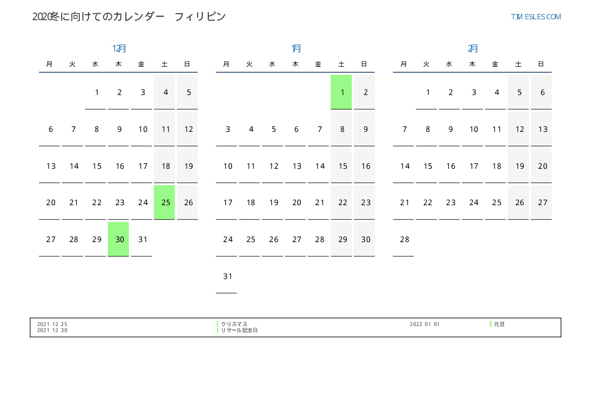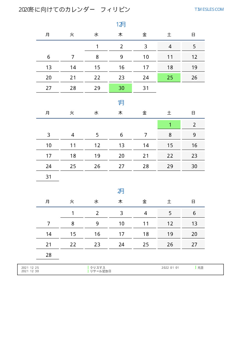 フィリピン向け2022冬に向けての休日と週末のカレンダー
