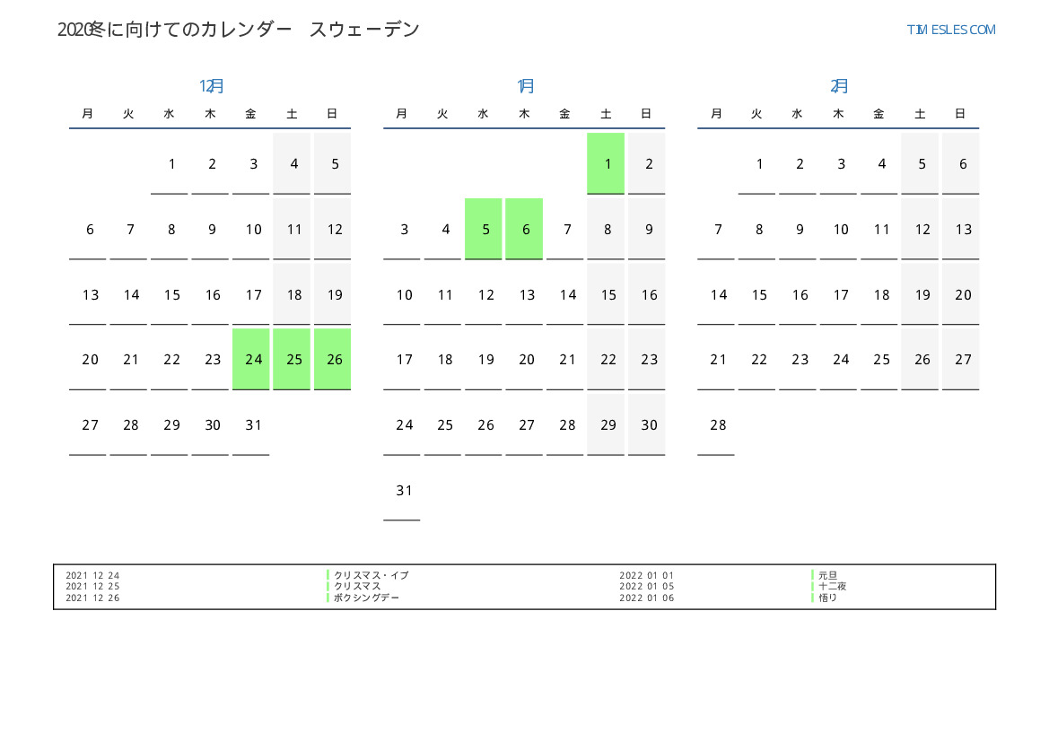 スウェーデン向け2022冬に向けての休日と週末のカレンダー