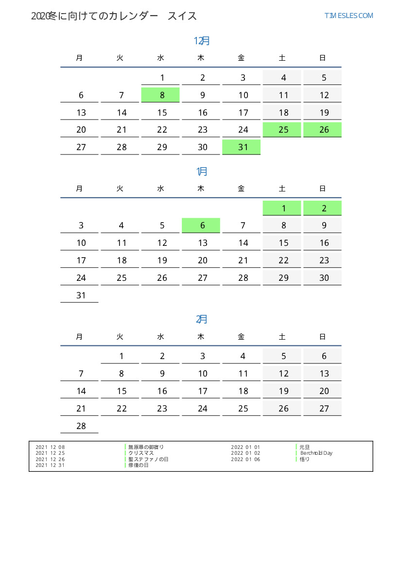 スイス向け2022冬に向けての休日と週末のカレンダー