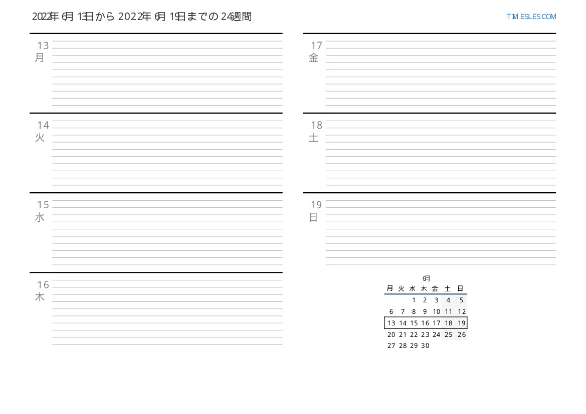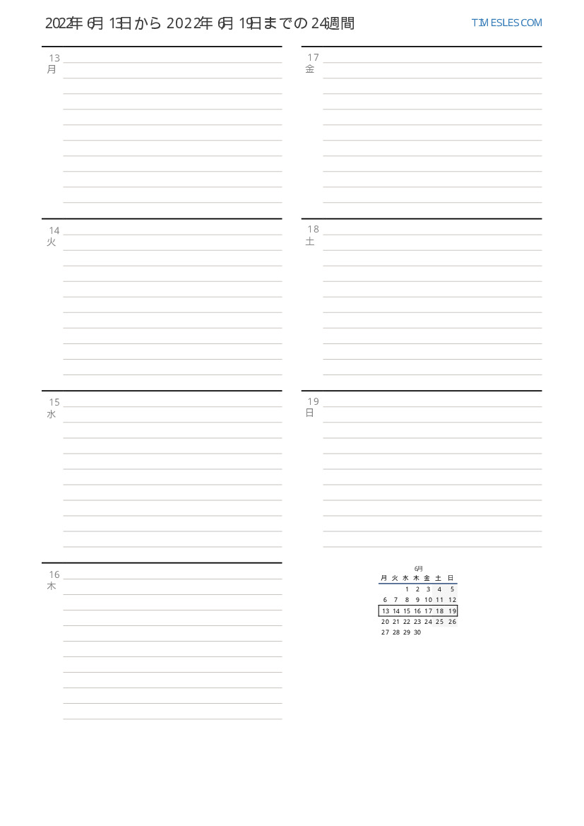 2022年2022年6月13日から2022年6月19日までの24週間、毎週PDFカレンダーをダウンロードして印刷します。