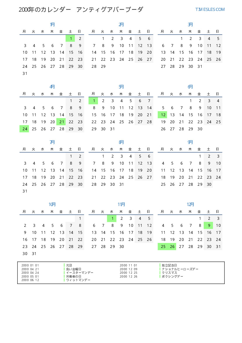 アンティグアバーブーダの2000年の休日と週末のカレンダー