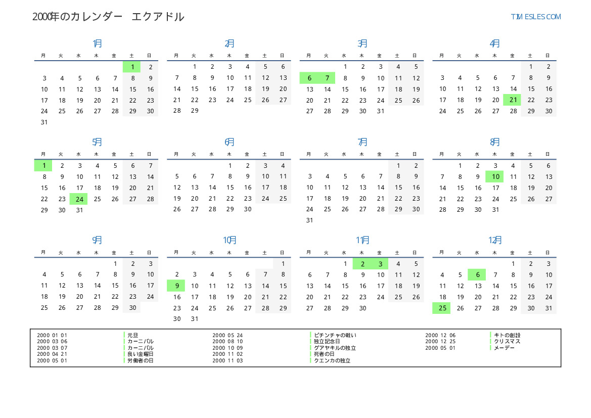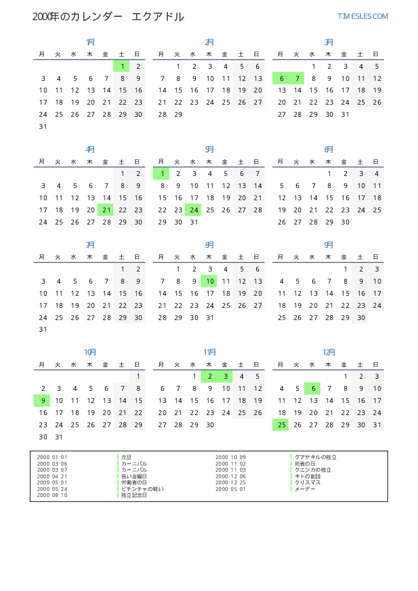 エクアドル向け2000年の休日と週末を含むPDFカレンダーをダウンロードして印刷します