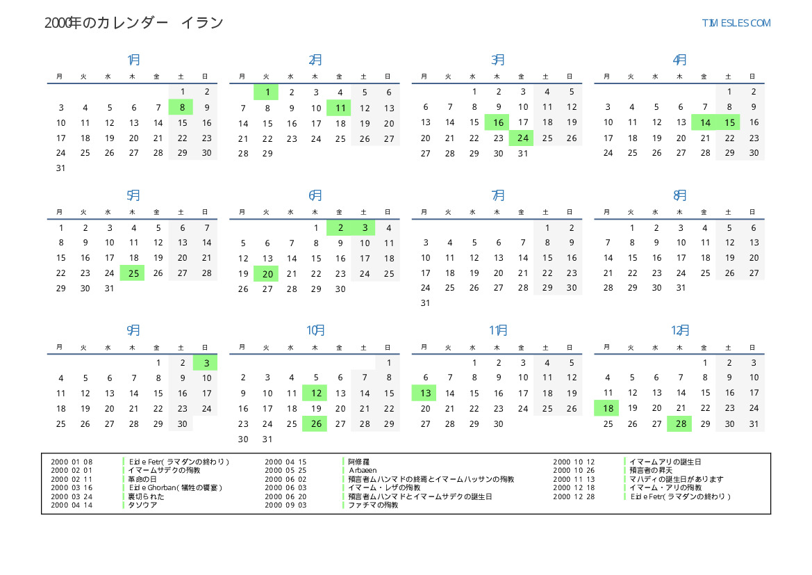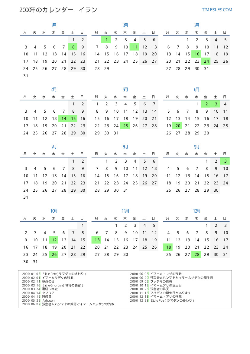 イランのために2000年の休日と週末を含むPDFカレンダーをダウンロードして印刷します