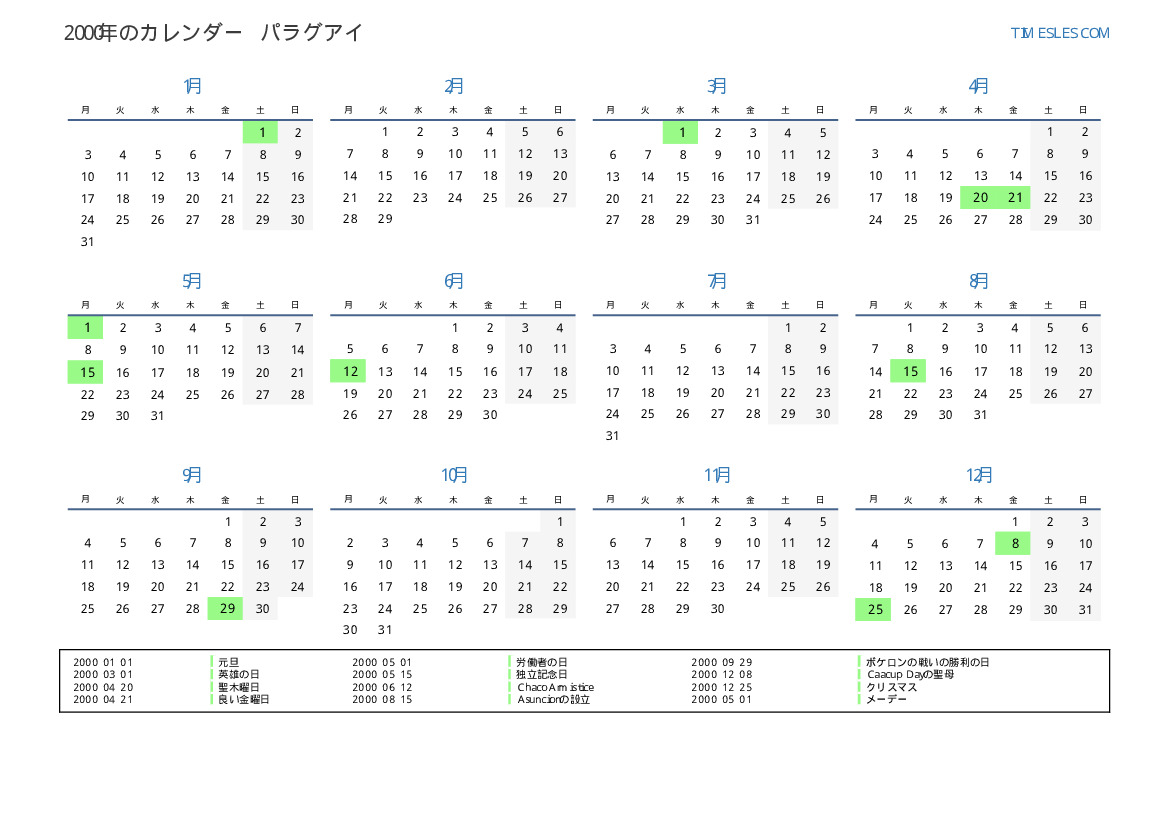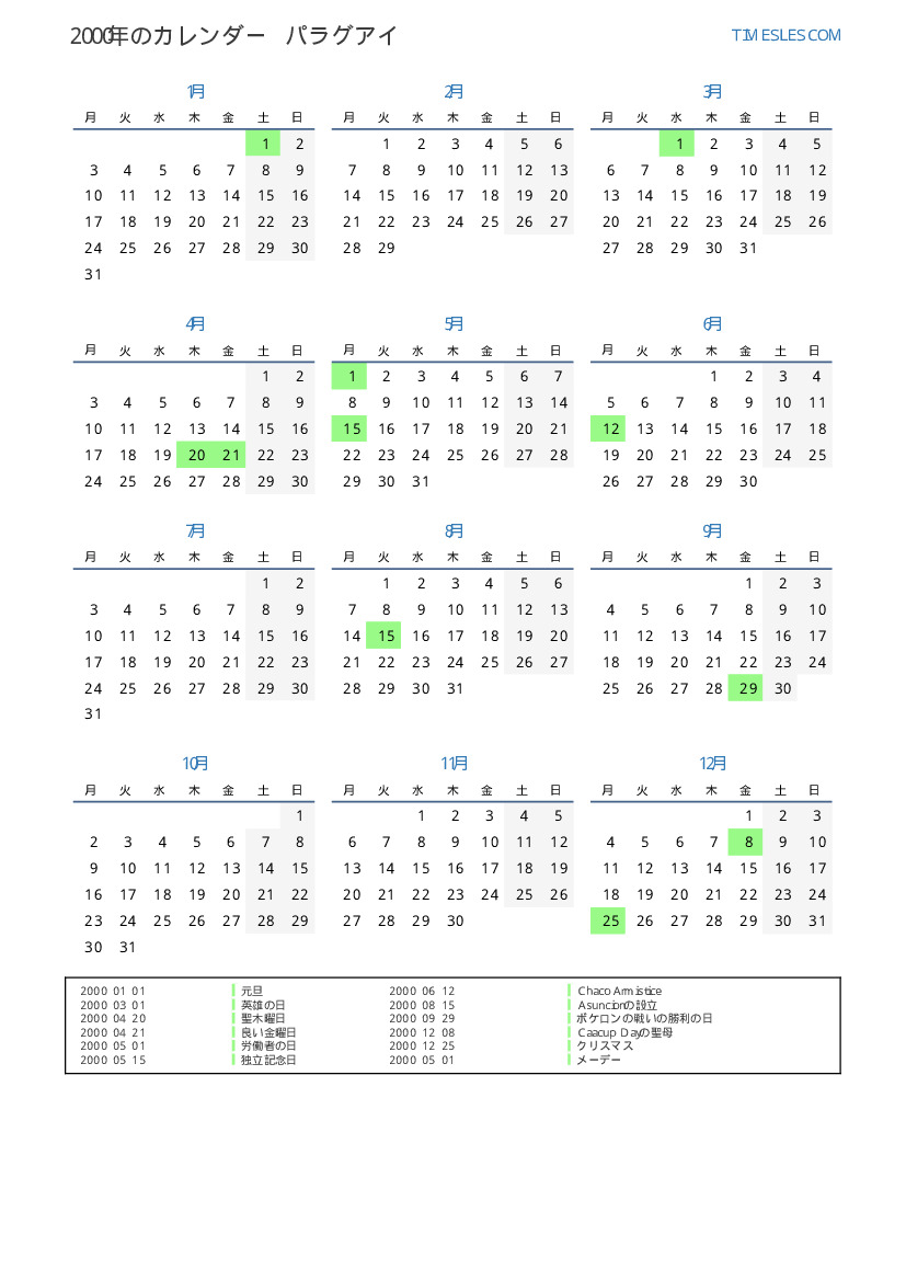 パラグアイ向けの2000年の休日と週末のカレンダー