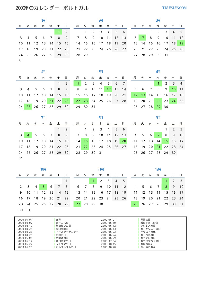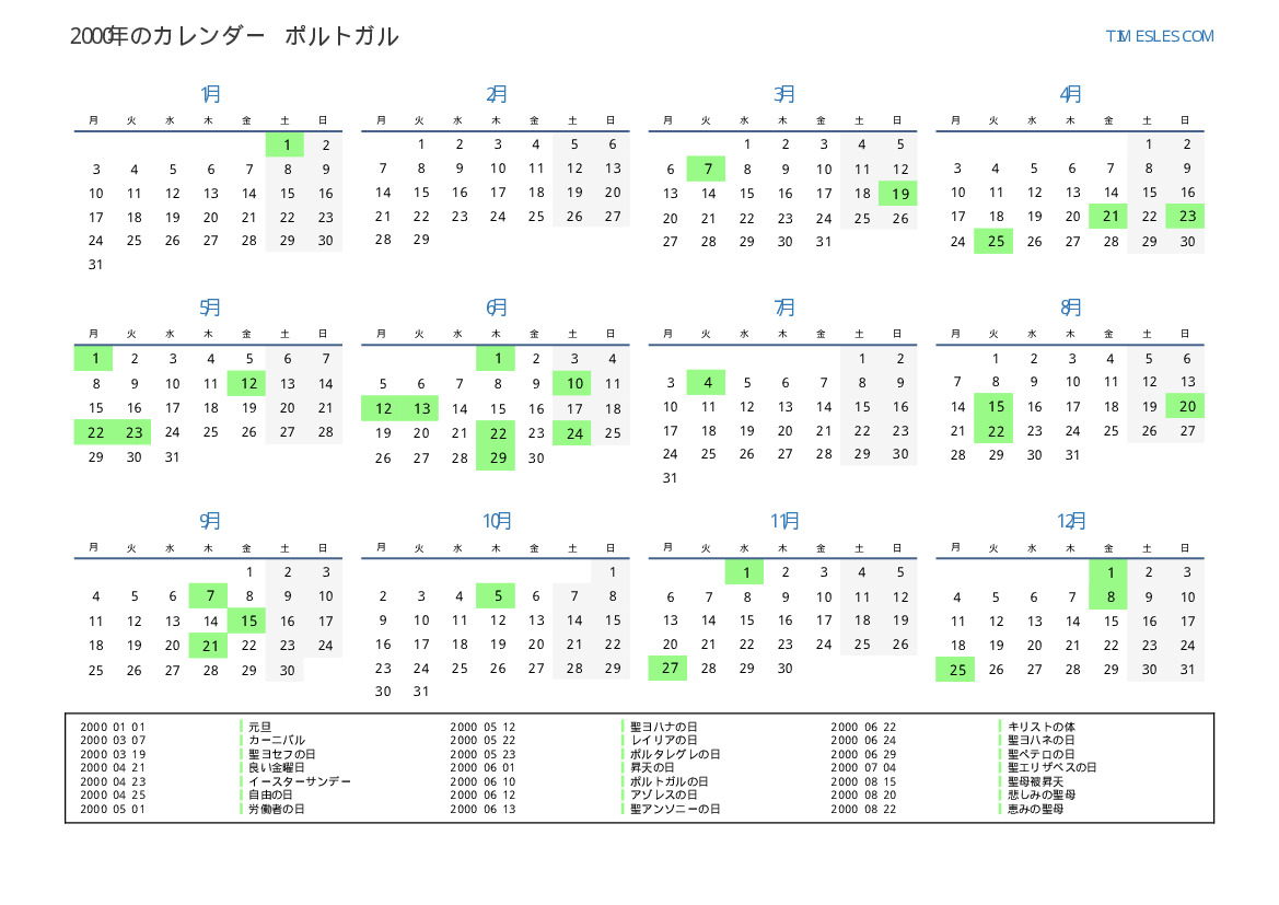 ポルトガル向けの2000年の休日と週末のカレンダー