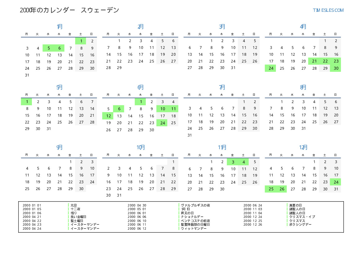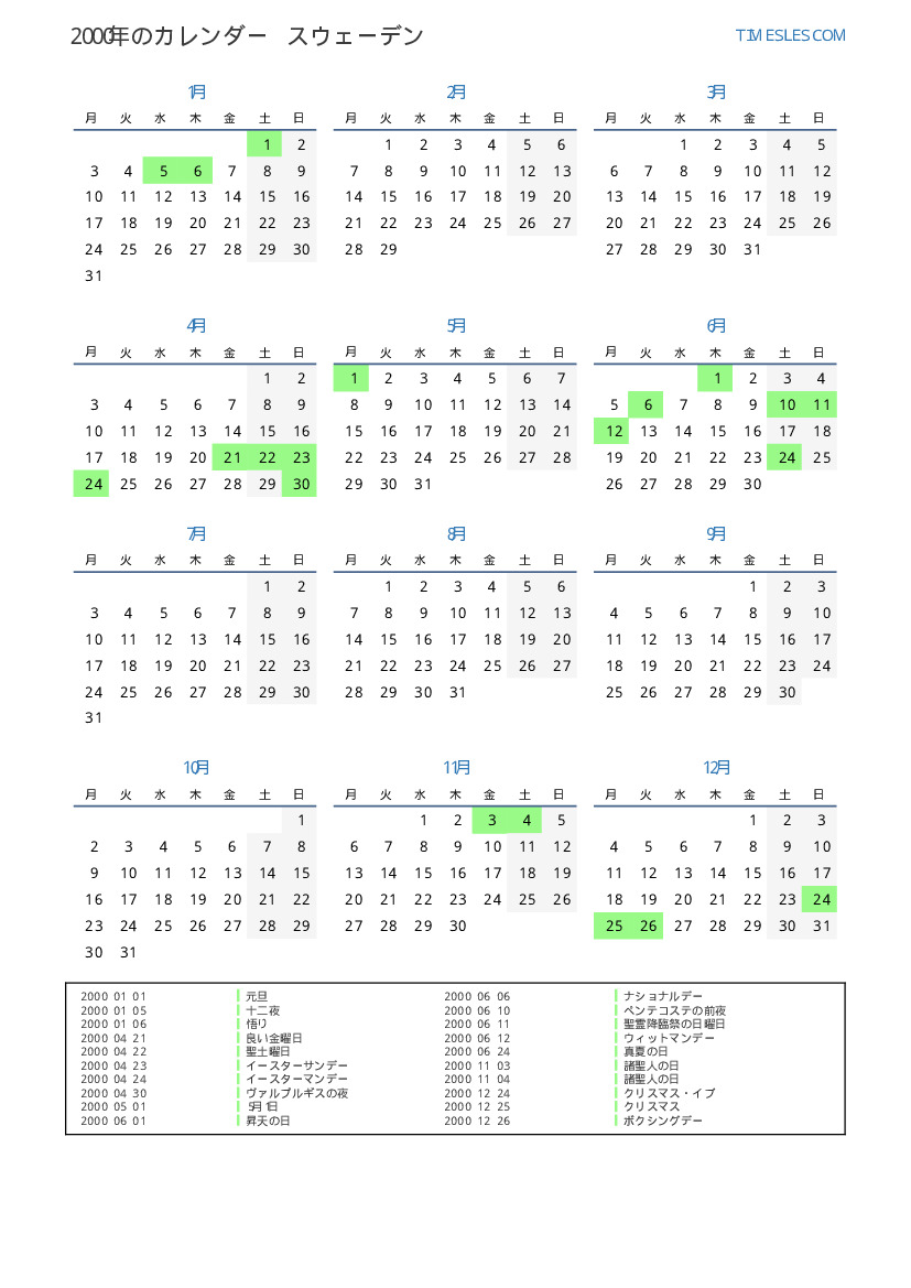 スウェーデン向けの2000年の休日と週末のカレンダー