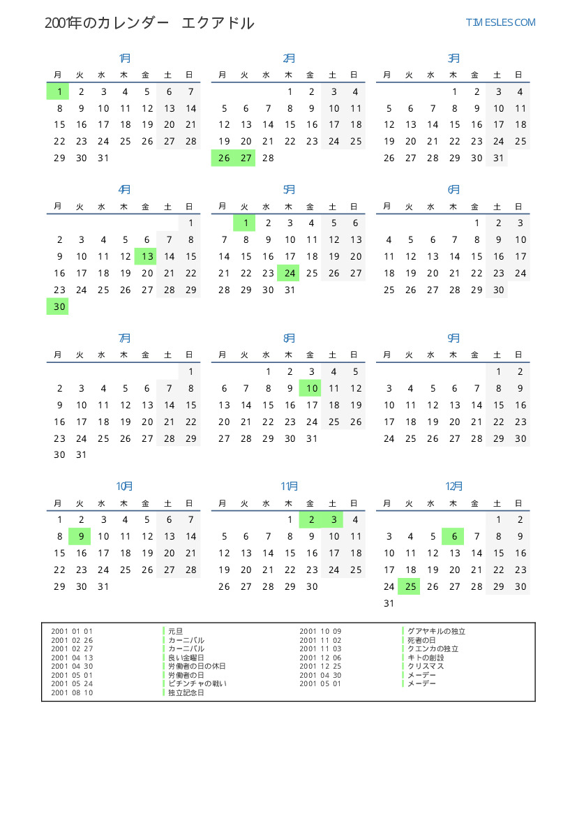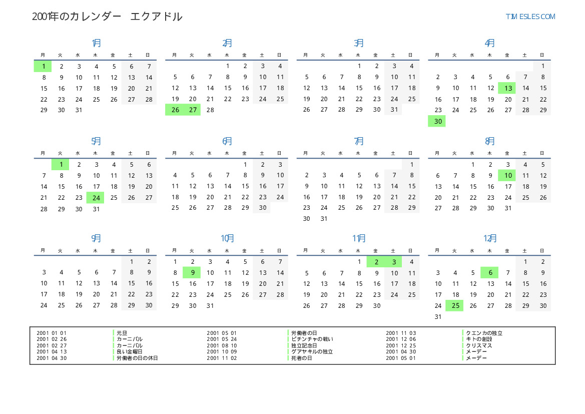 エクアドル向けの2001年の休日と週末のカレンダー