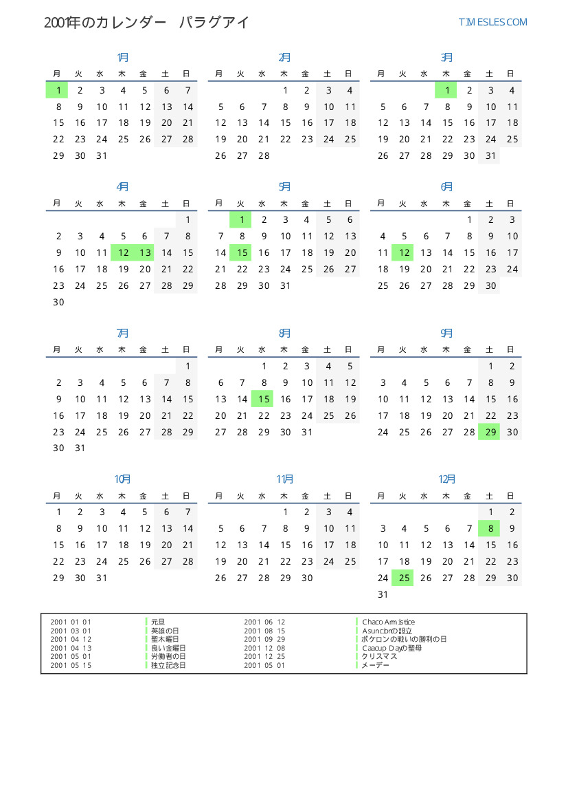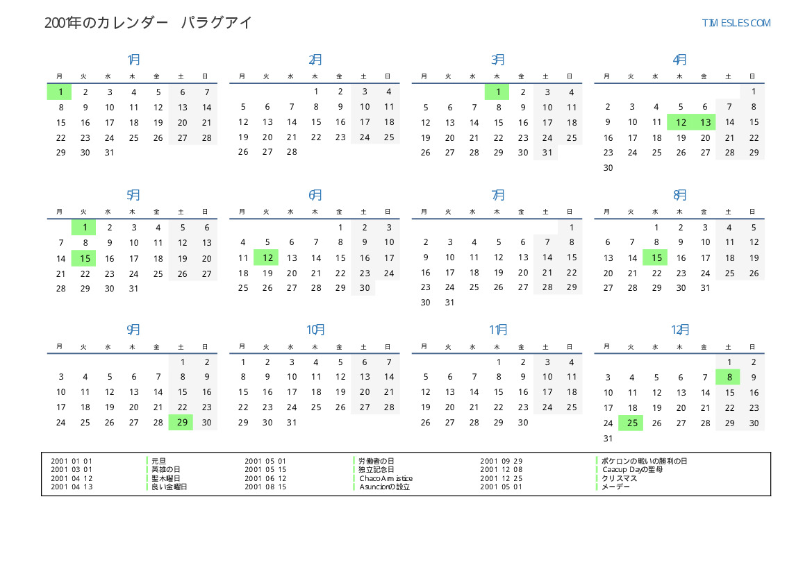 パラグアイ向けの2001年の休日と週末のカレンダー
