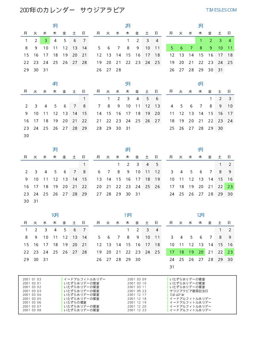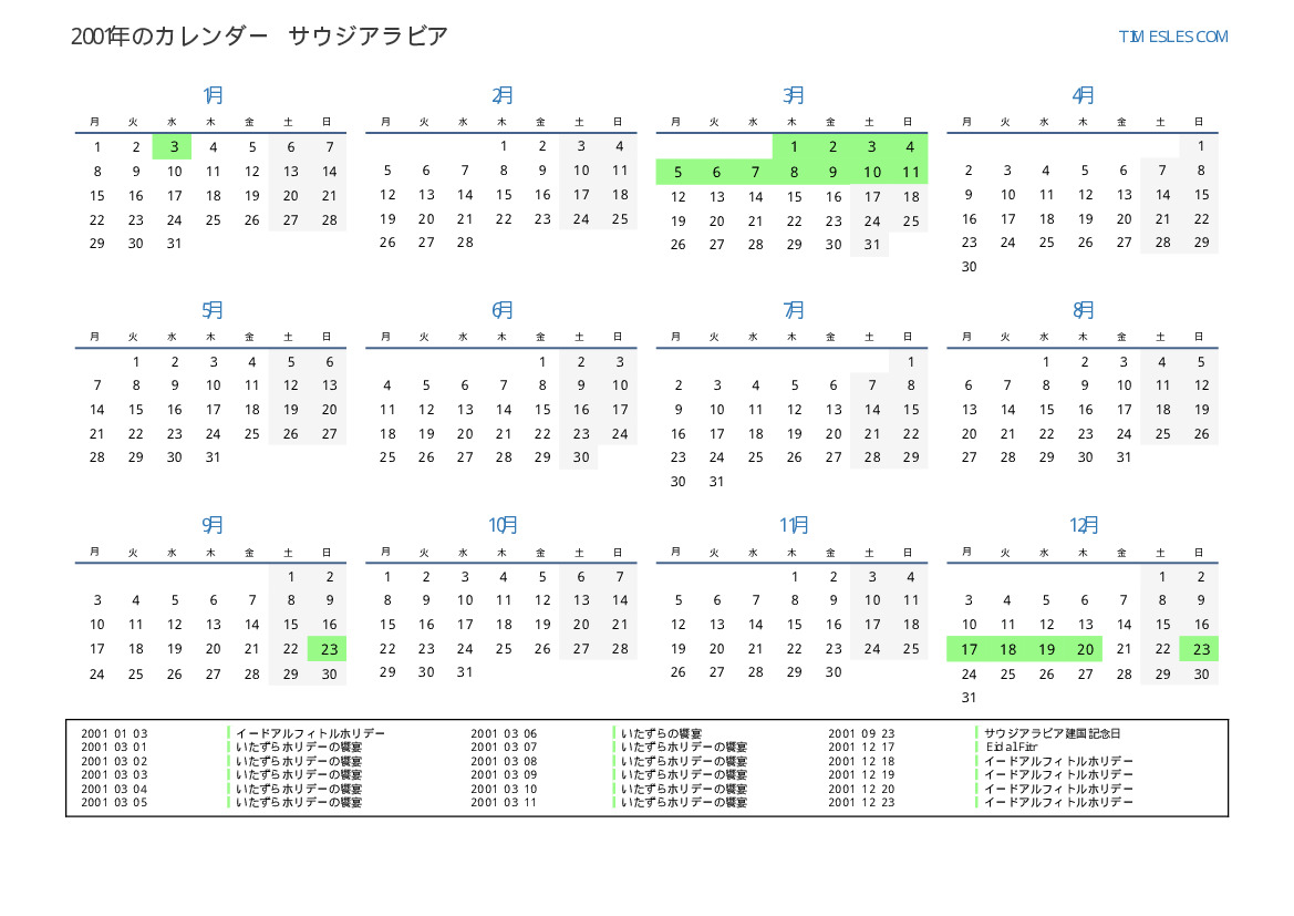 サウジアラビア向けの2001年の休日と週末のカレンダー