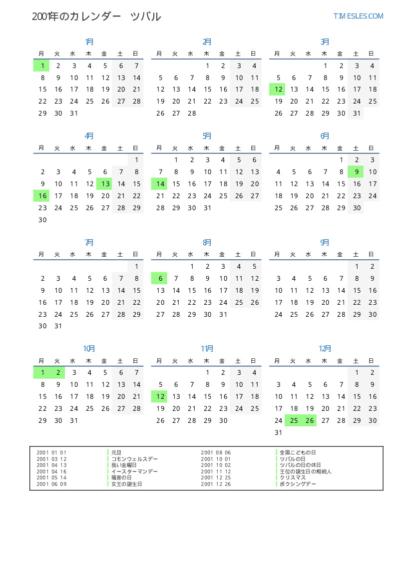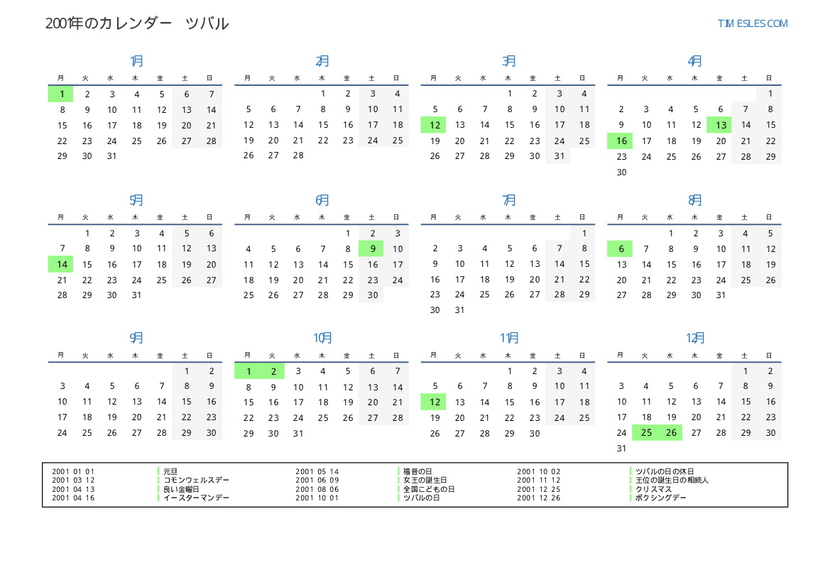 グレゴリオ暦、うるう年ではありません、年間365日。 2001年には、ツバル語17 休日と休日。 中国東部の暦では、2000年ヘビの年。 年は月曜日にに始まり、月曜日に終わります。