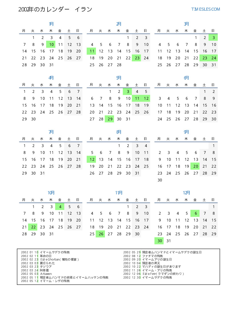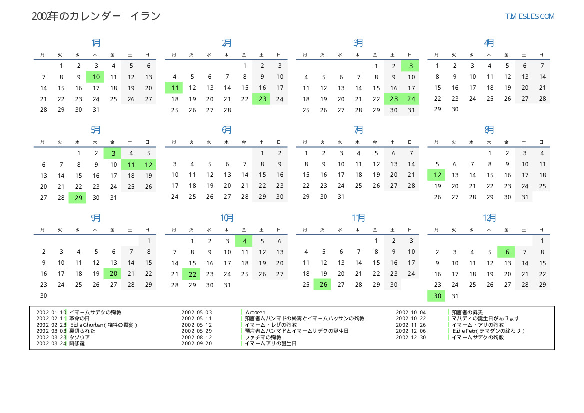 イランのために2002年の休日と週末を含むPDFカレンダーをダウンロードして印刷します