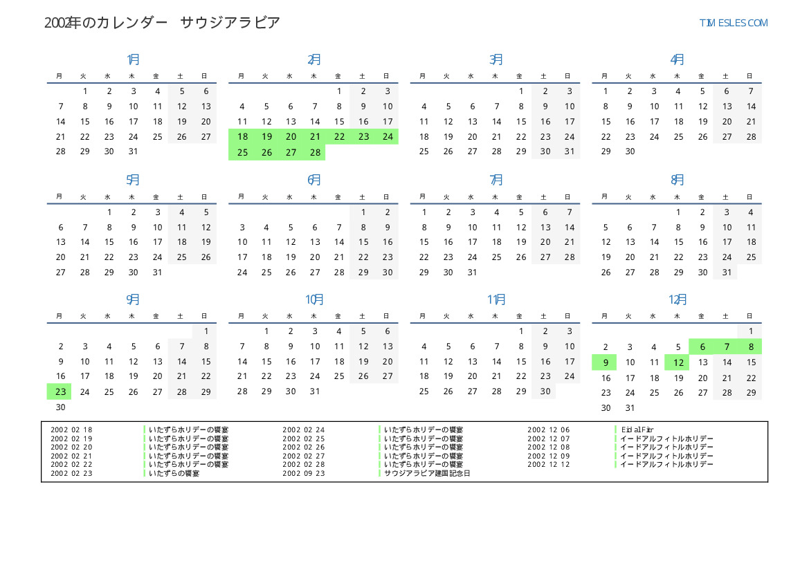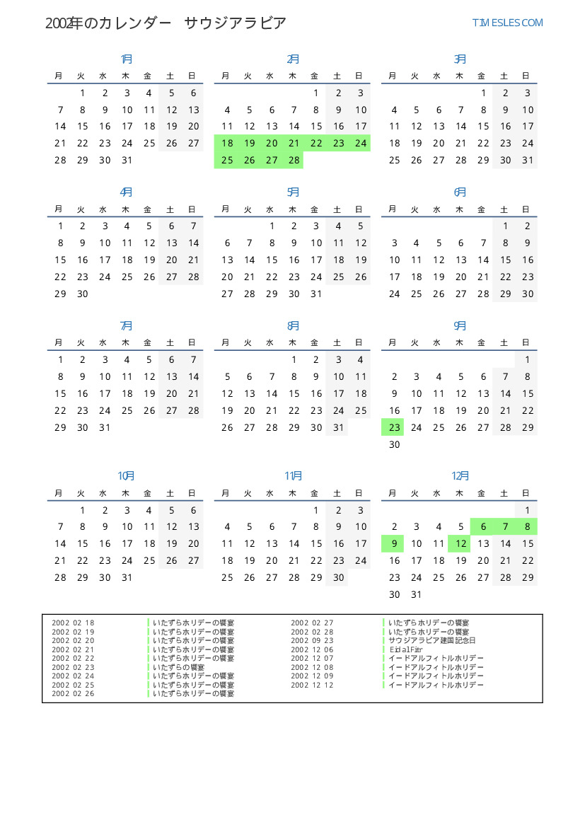 サウジアラビア向けの2002年の休日と週末のカレンダー