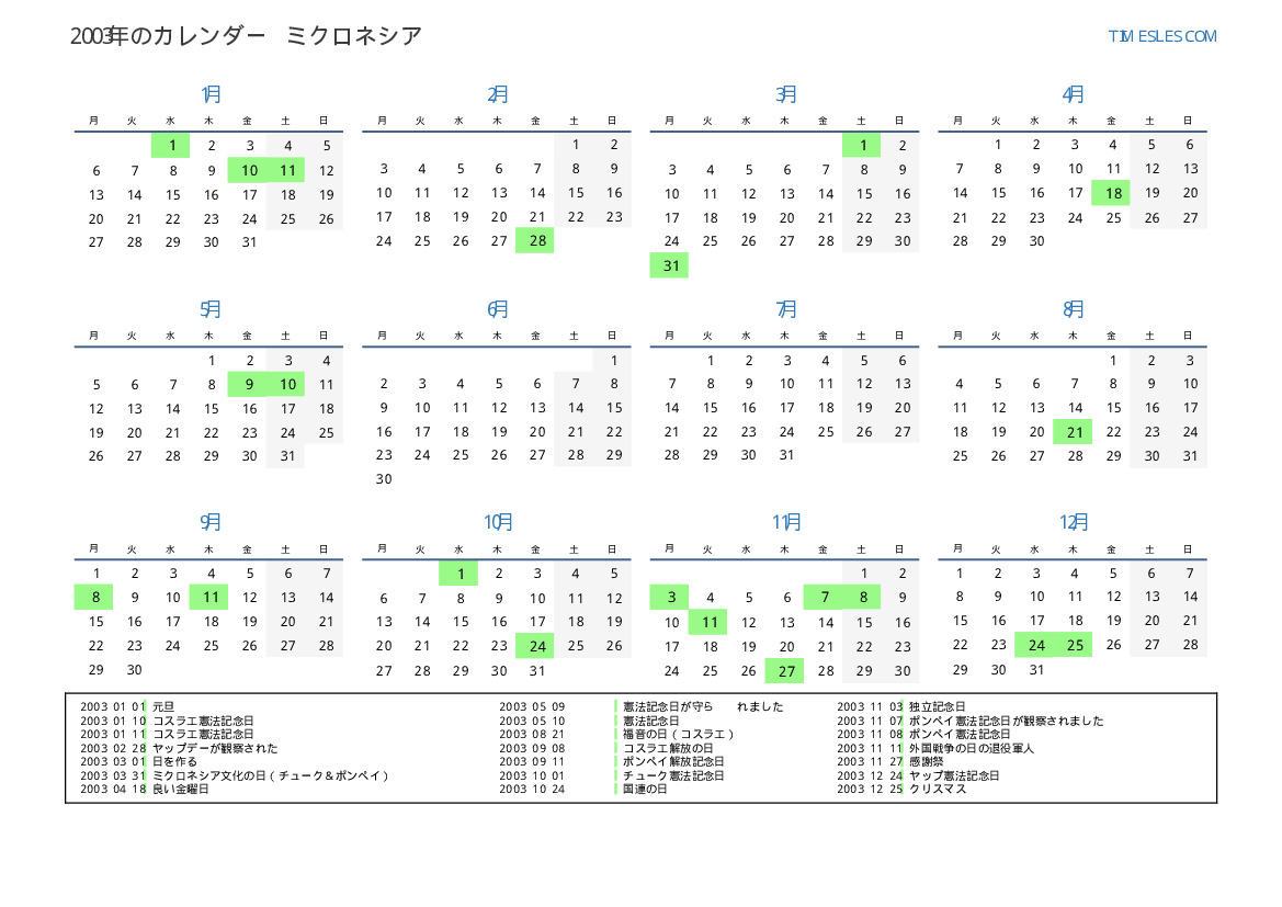 ミクロネシア向けの2003年の休日と週末のカレンダー