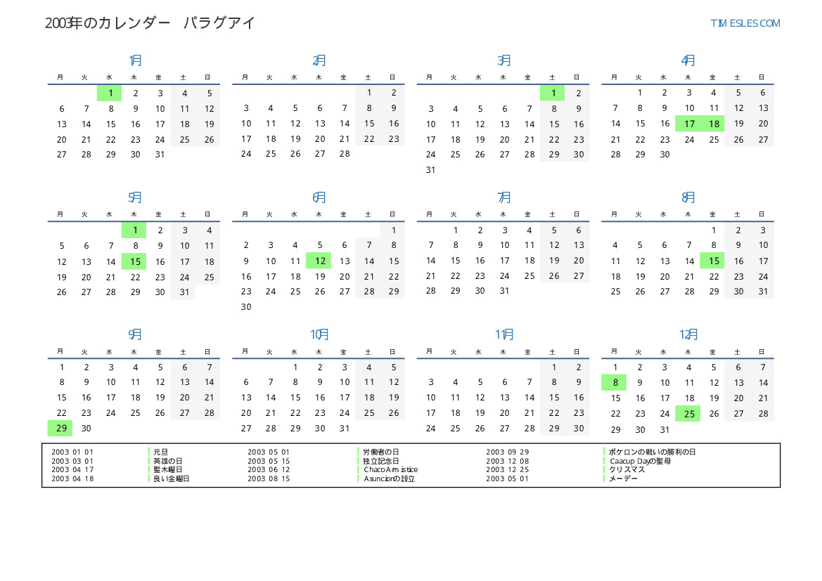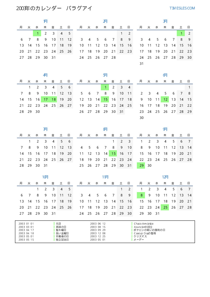 パラグアイ向けの2003年の休日と週末のカレンダー