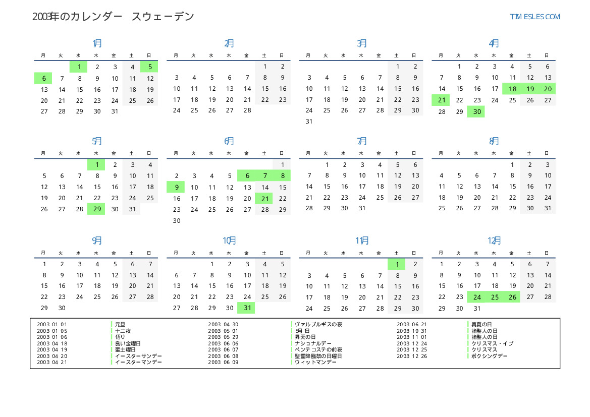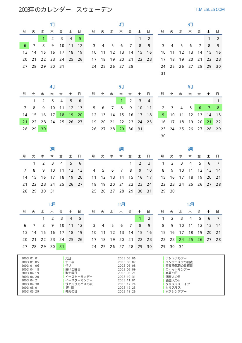 スウェーデン向けの2003年の休日と週末のカレンダー