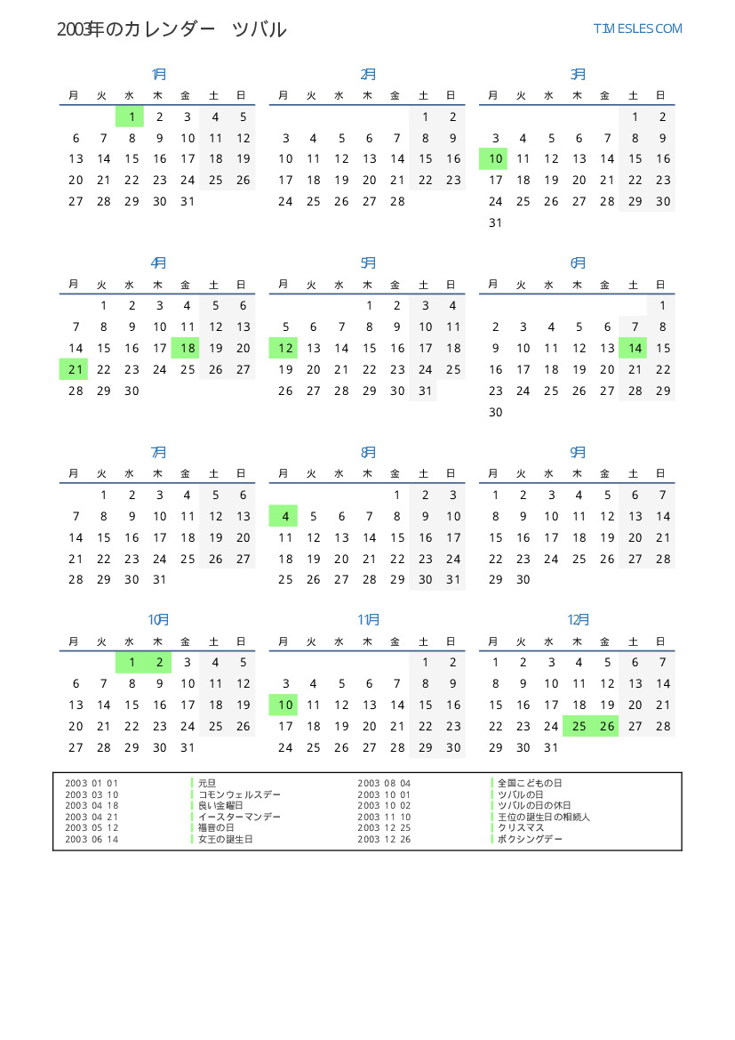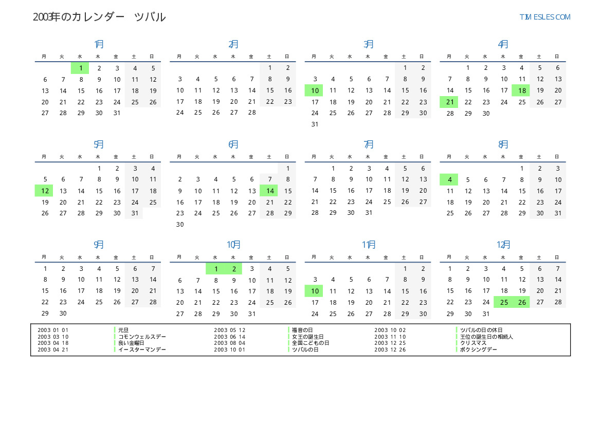 グレゴリオ暦、うるう年ではありません、年間365日。 2003年には、ツバル語17 休日と休日。 中国東部の暦では、2000年羊の年。 年は水曜日にに始まり、水曜日に終わります。