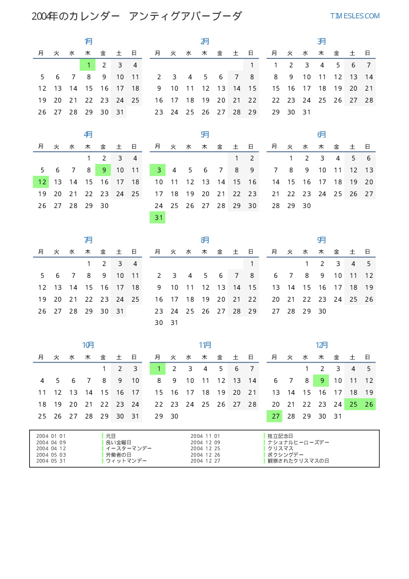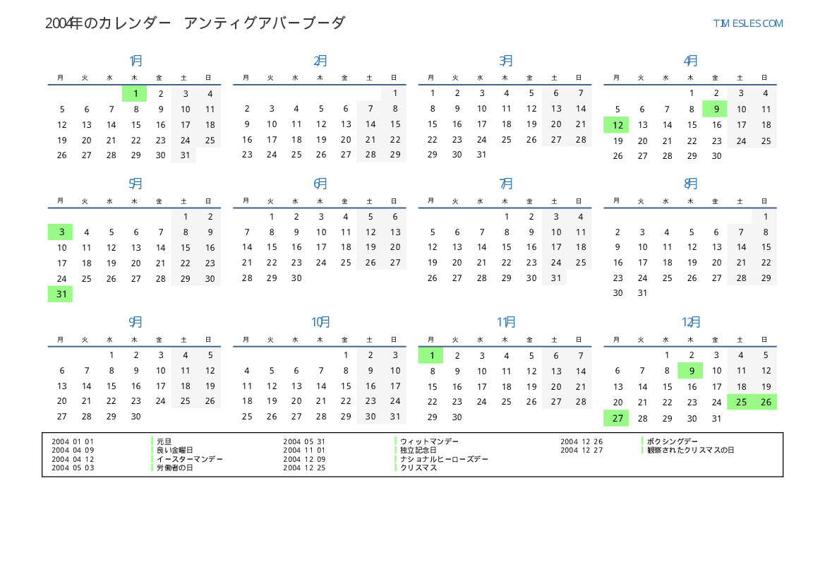 アンティグアバーブーダの2004年の休日と週末のカレンダー