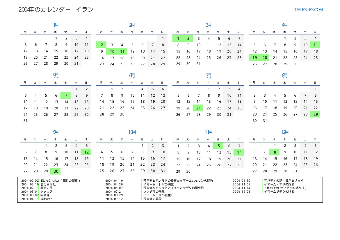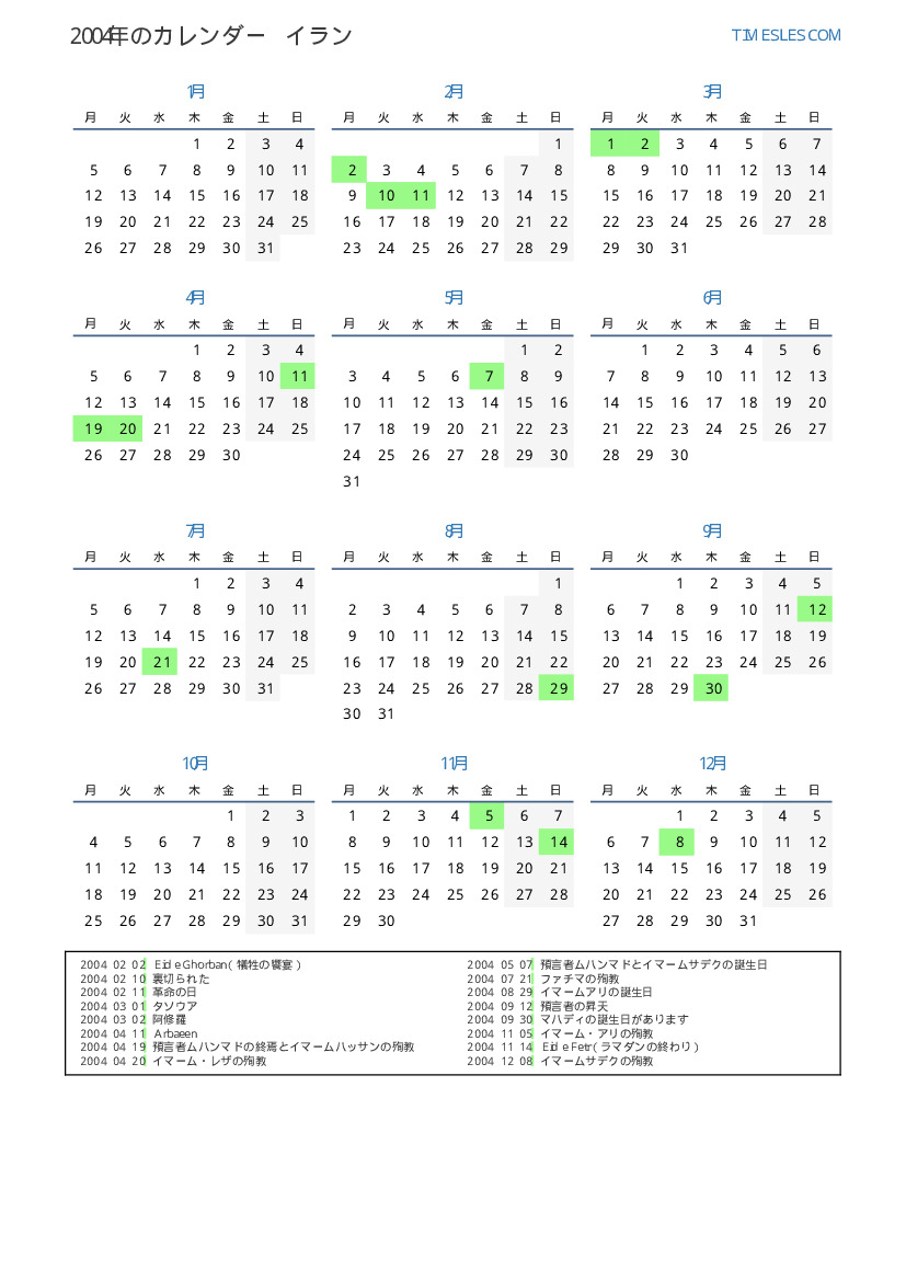 イランのために2004年の休日と週末を含むPDFカレンダーをダウンロードして印刷します
