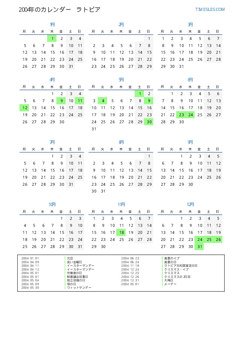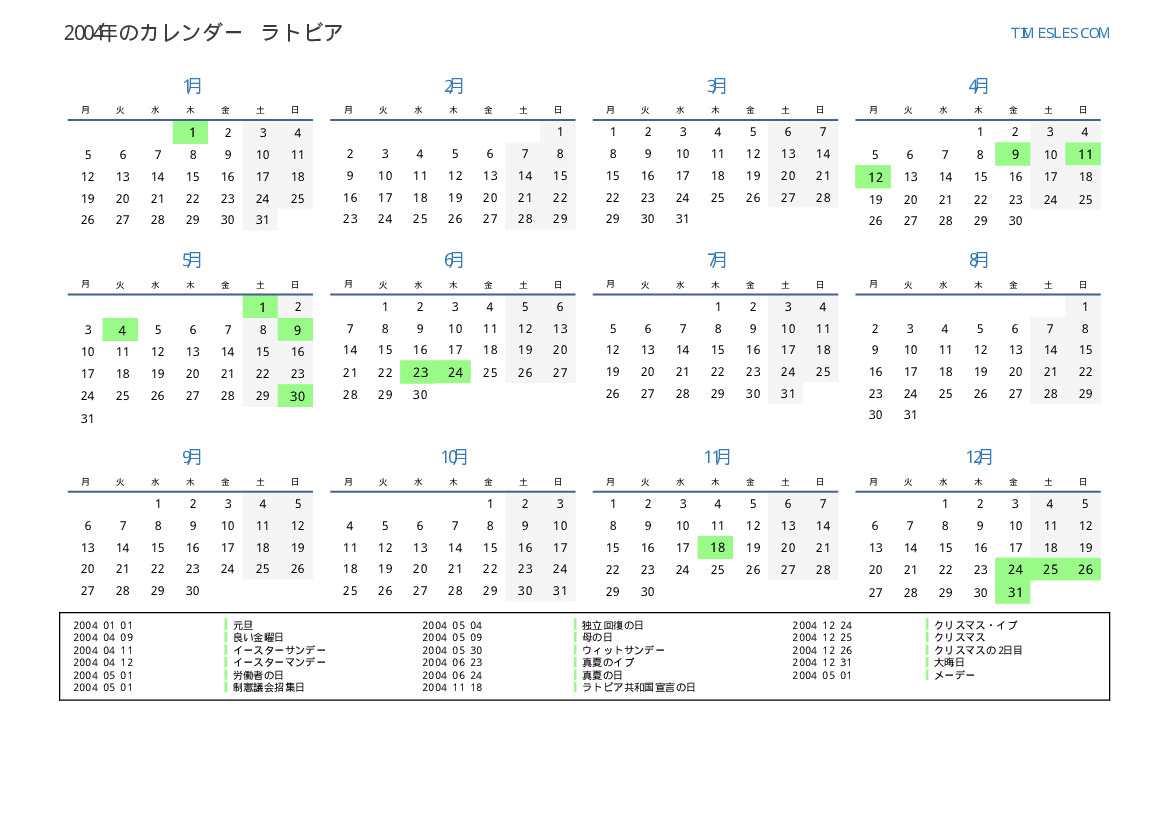 ラトビア向けの2004年の休日と週末のカレンダー