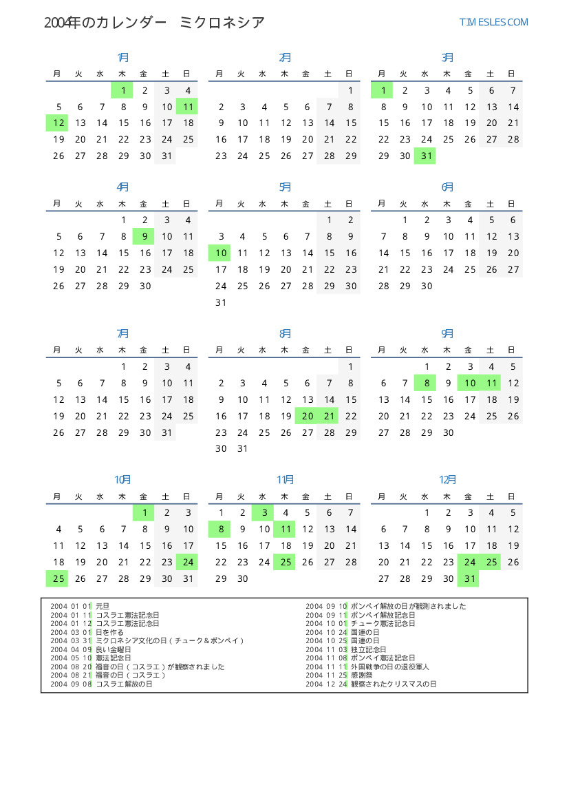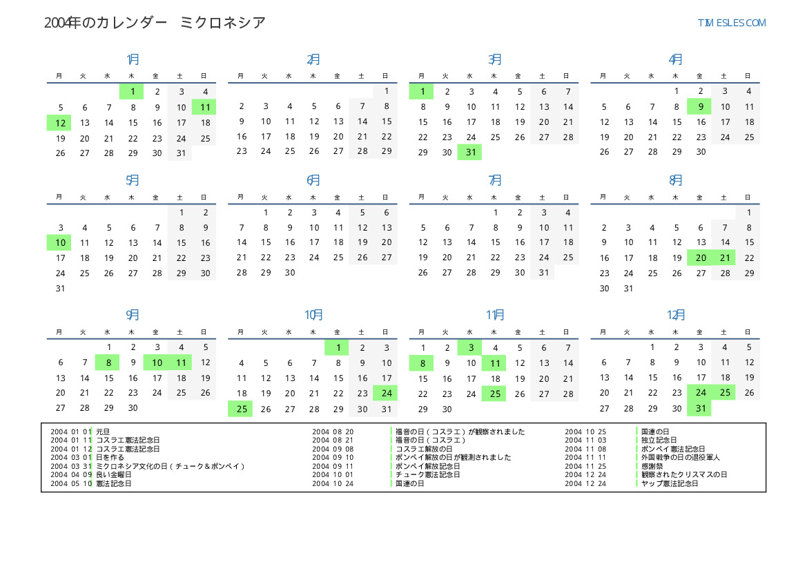 ミクロネシア向けの2004年の休日と週末のカレンダー