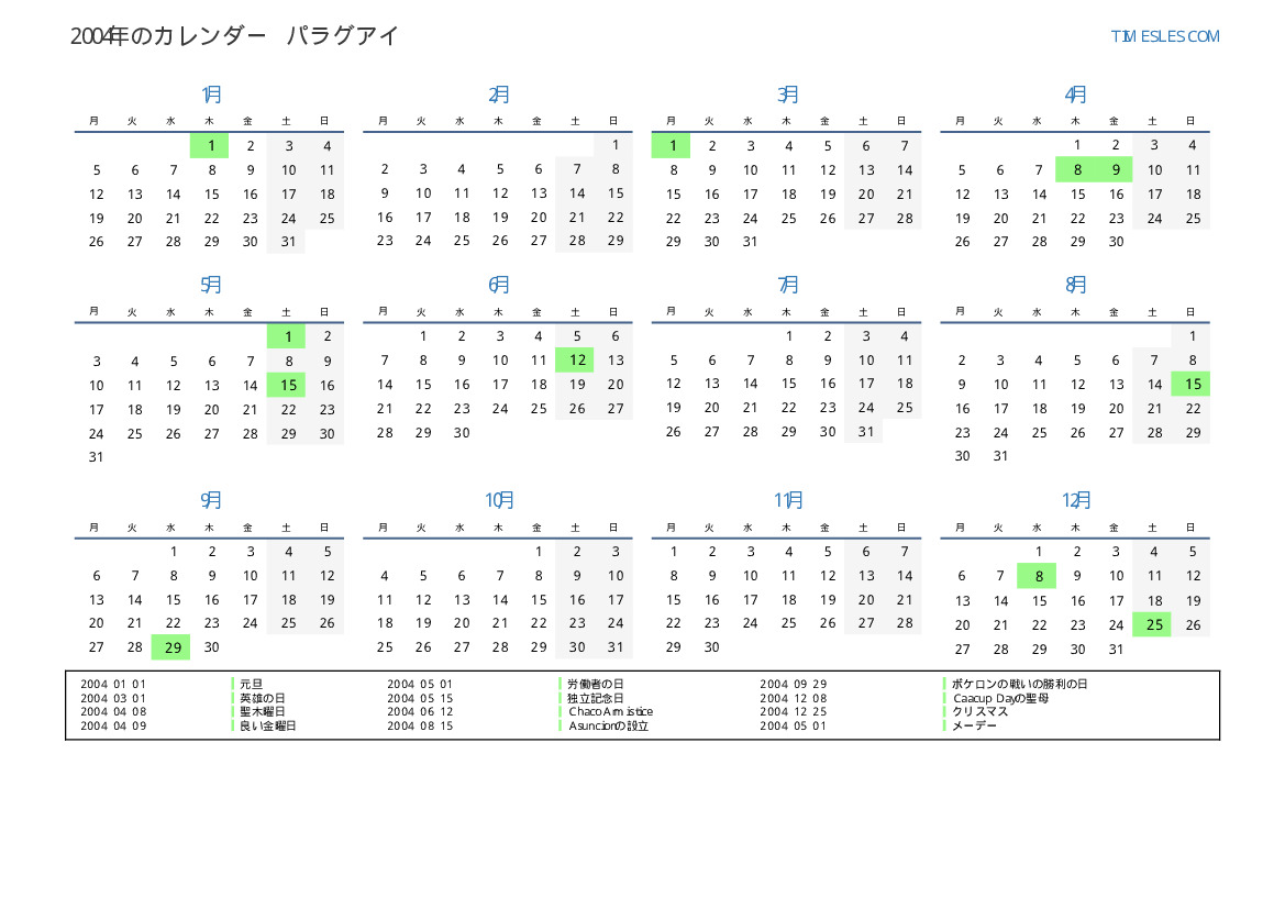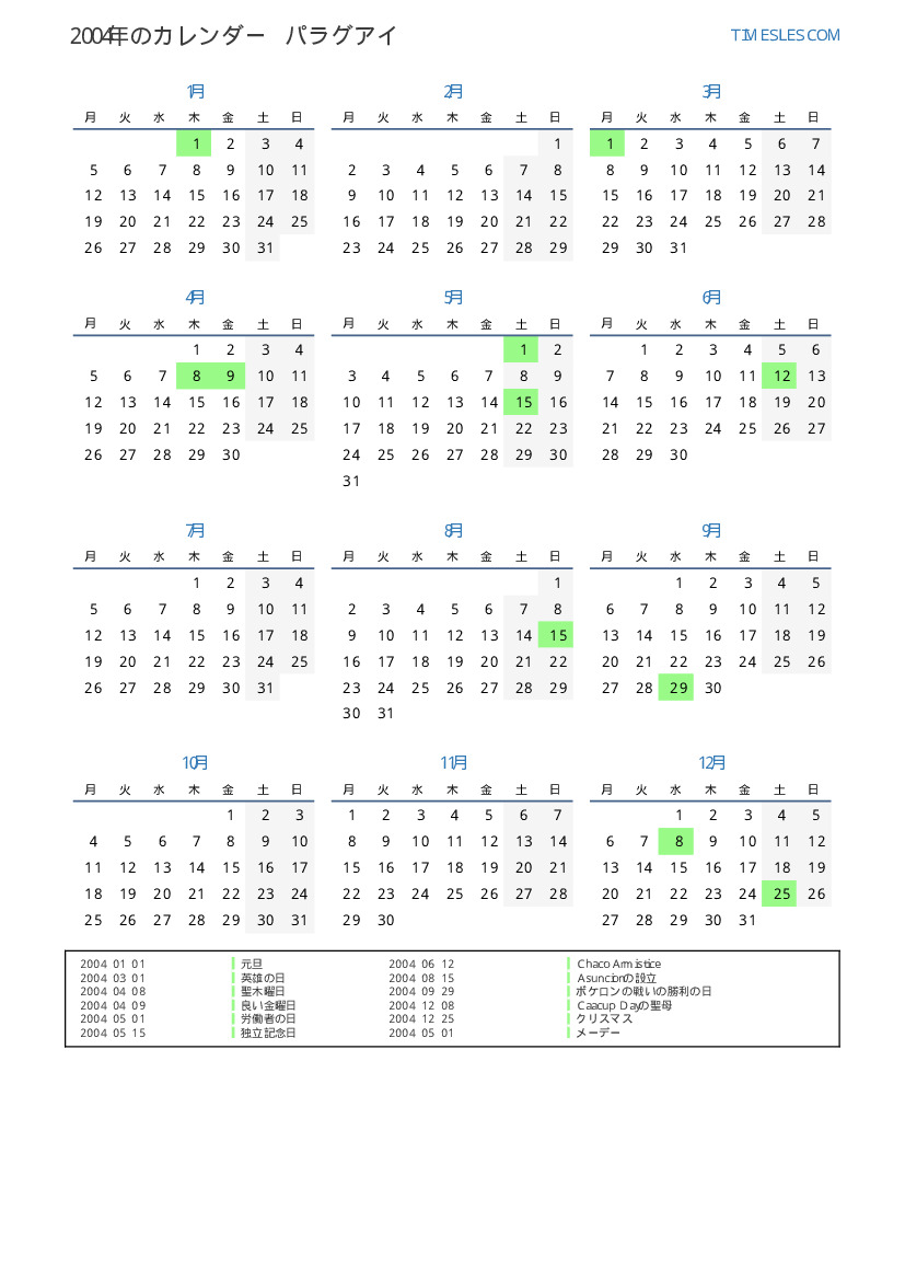 パラグアイ向けの2004年の休日と週末のカレンダー
