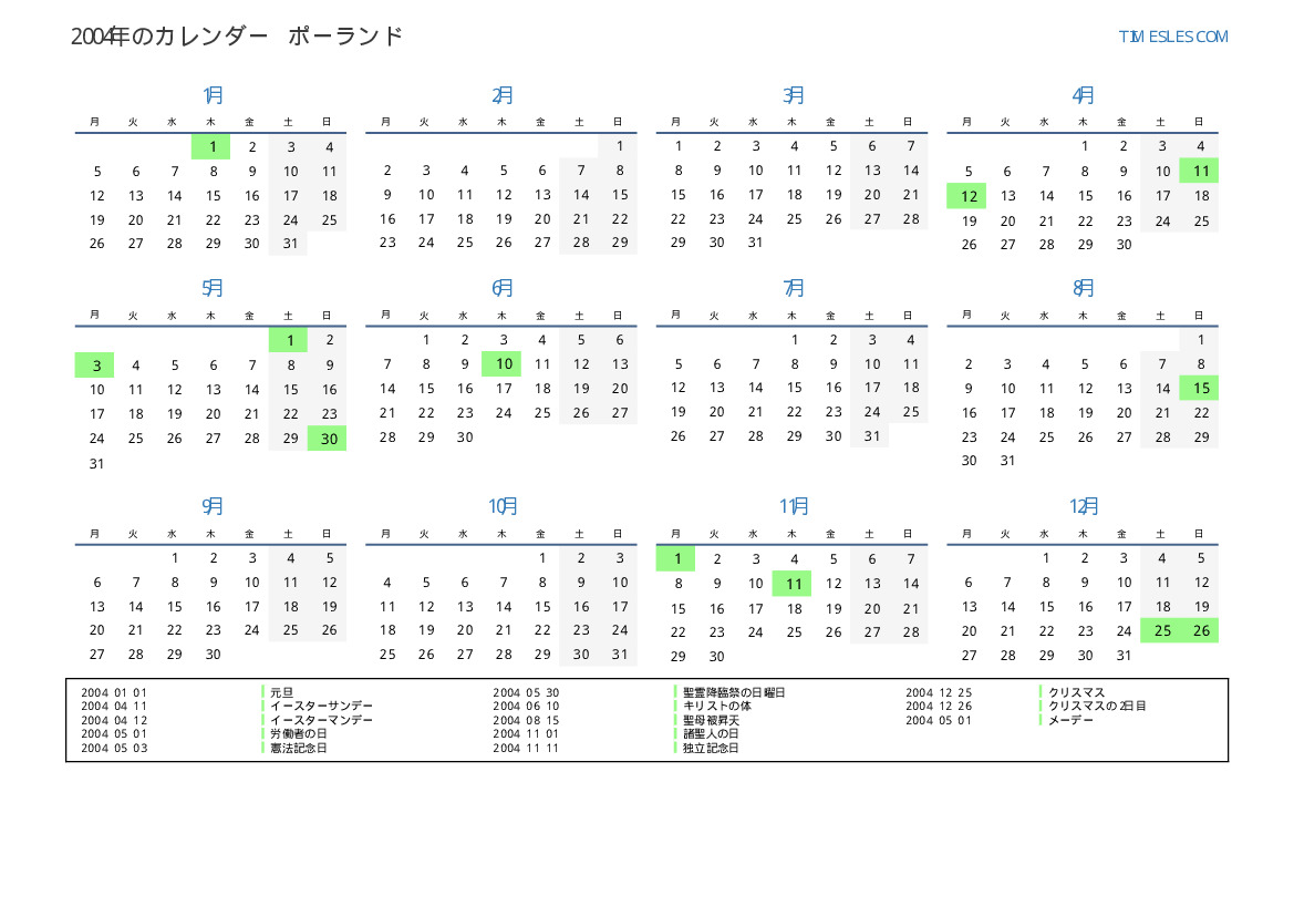 ポーランド向け2004年の休日と週末を含むPDFカレンダーをダウンロードして印刷します