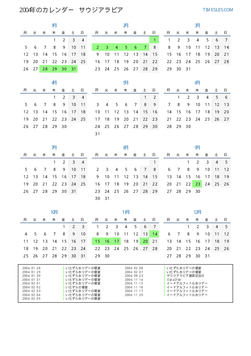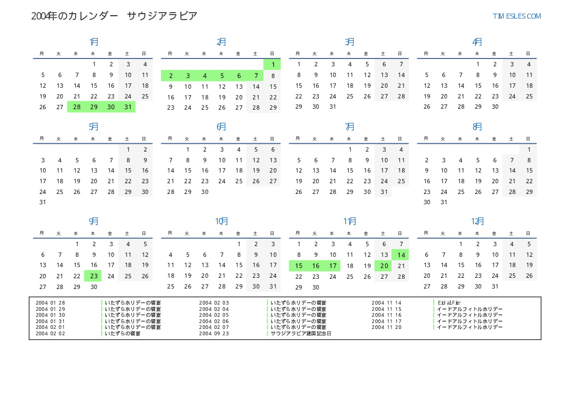 サウジアラビア向けの2004年の休日と週末のカレンダー
