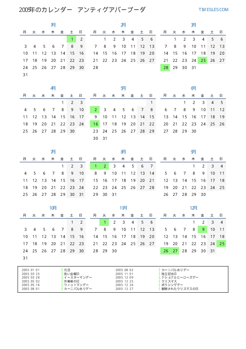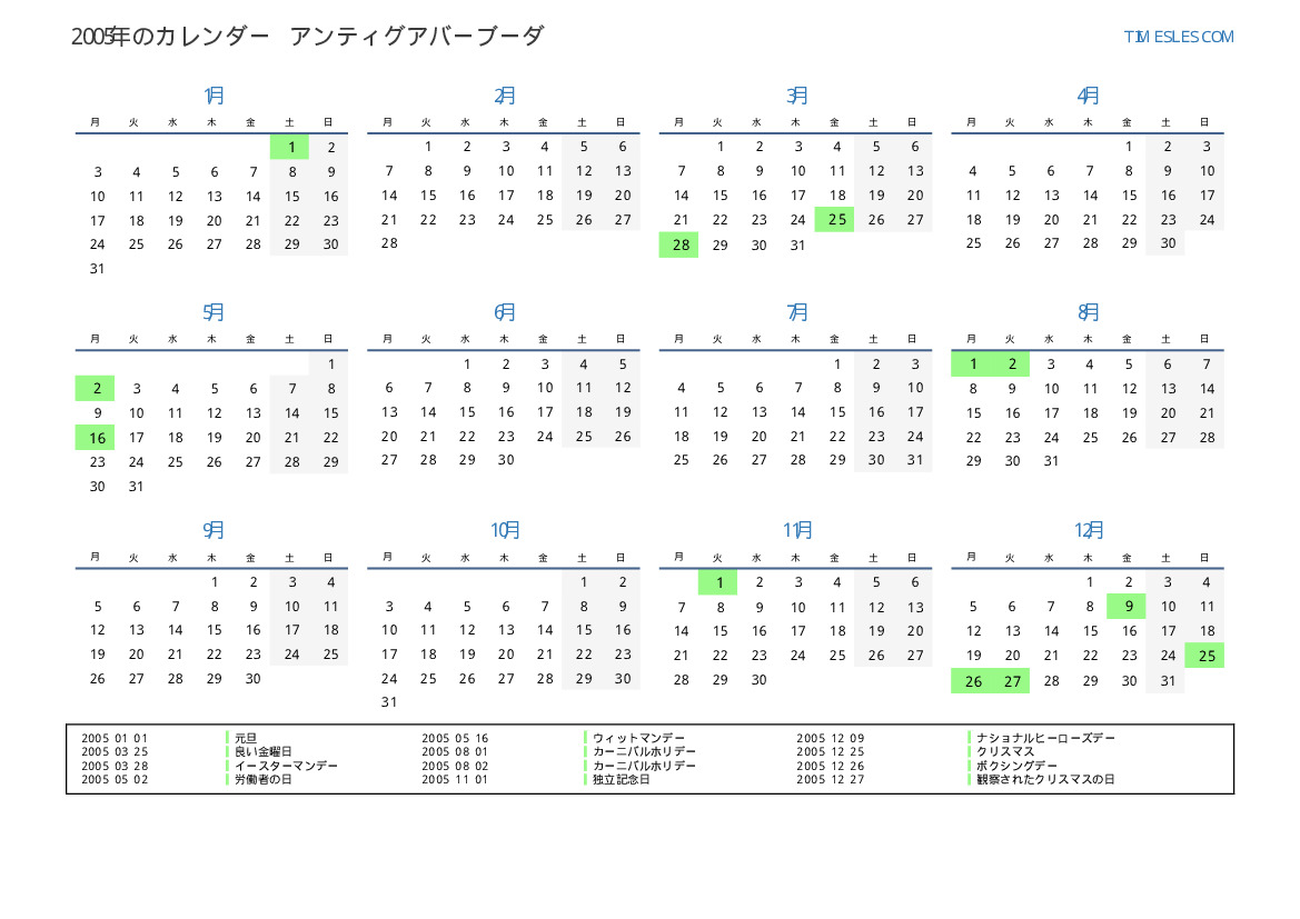アンティグアバーブーダの2005年の休日と週末のカレンダー