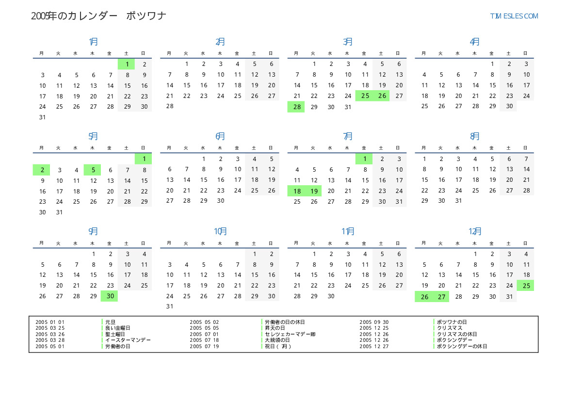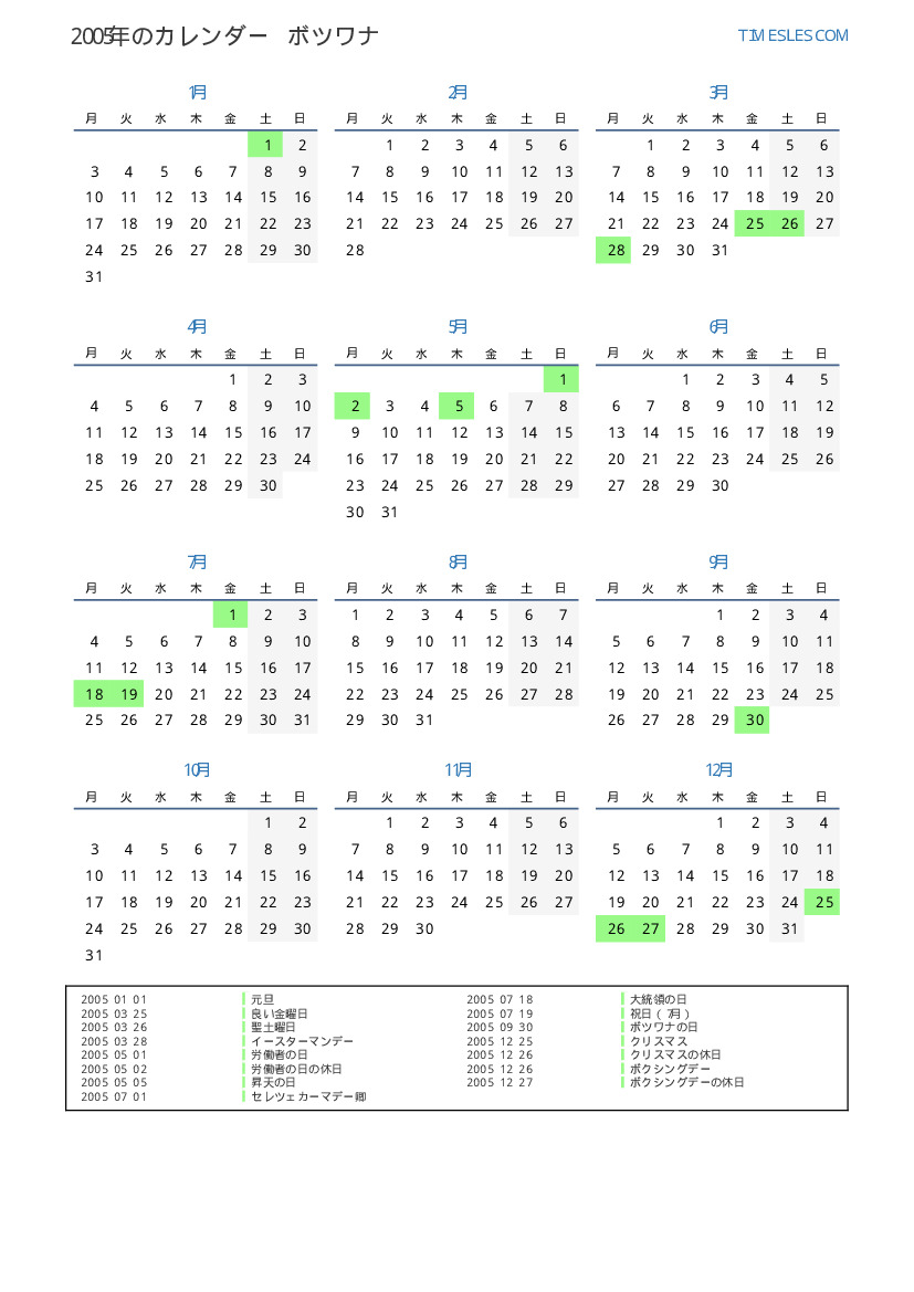ボツワナ向けの2005年の休日と週末のカレンダー