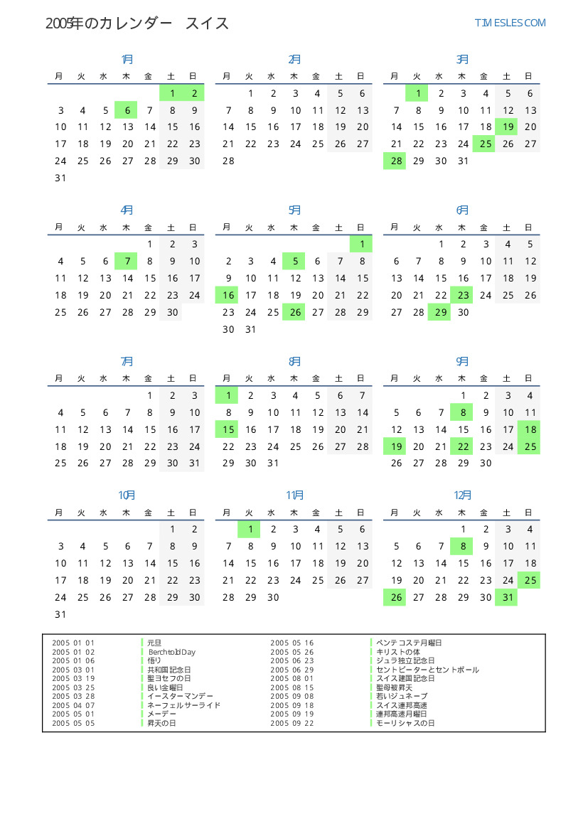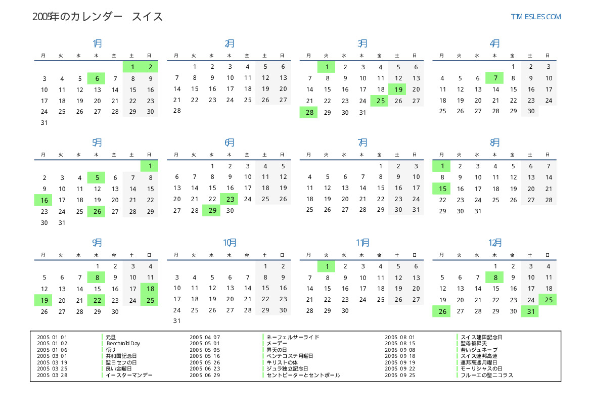 スイス向け2005年の休日と週末を含むPDFカレンダーをダウンロードして印刷します
