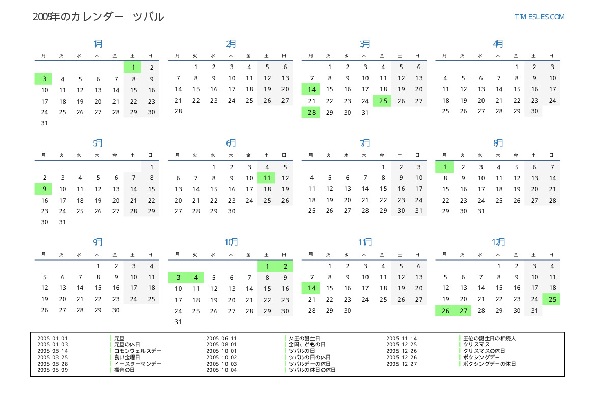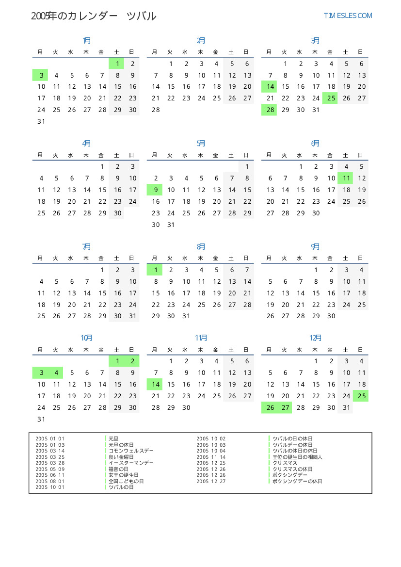 ツバル向けの2005年の休日と週末のカレンダー