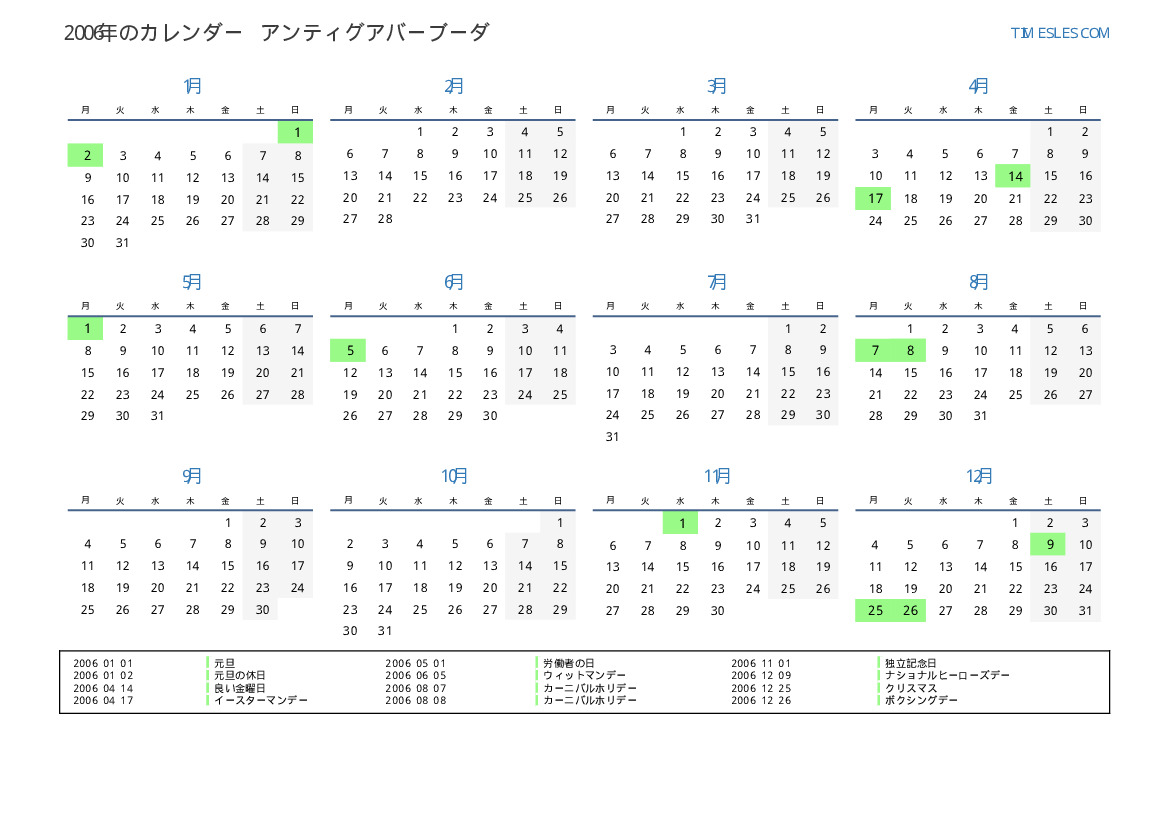 アンティグアバーブーダの2006年の休日と週末のカレンダー