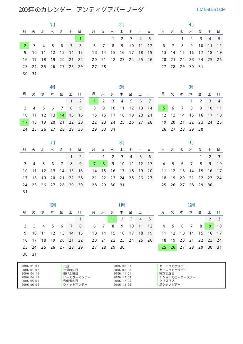 アンティグアバーブーダ2006年の休日と週末を含むPDFカレンダーをダウンロードして印刷します