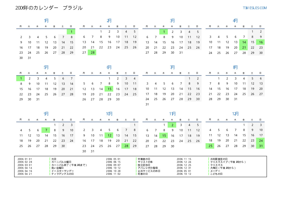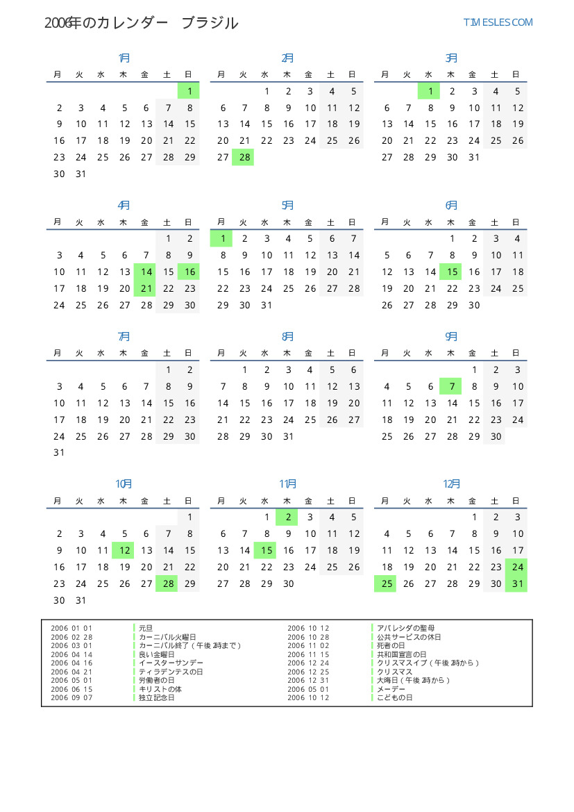 ブラジル向け2006年の休日と週末を含むPDFカレンダーをダウンロードして印刷します