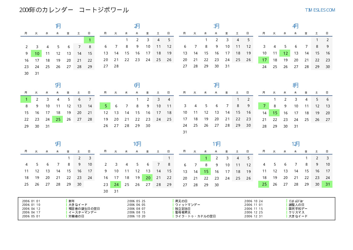 グレゴリオ暦、うるう年ではありません、年間365日。 2006年には、コートジボワール19 休日と休日。 中国東部の暦では、2000年犬の年。 年は日曜日にに始まり、日曜日に終わります。