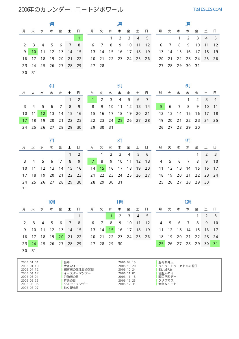 コートジボワール2006年の休日と週末を含むPDFカレンダーをダウンロードして印刷します