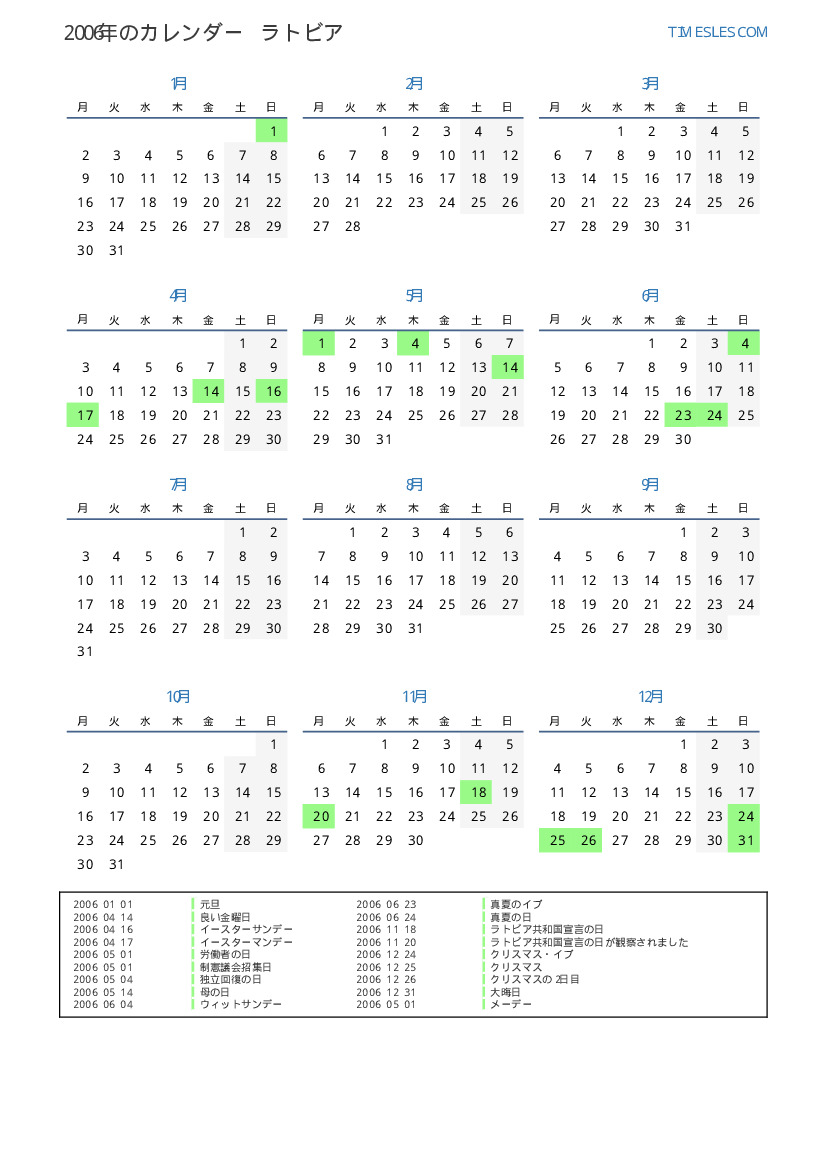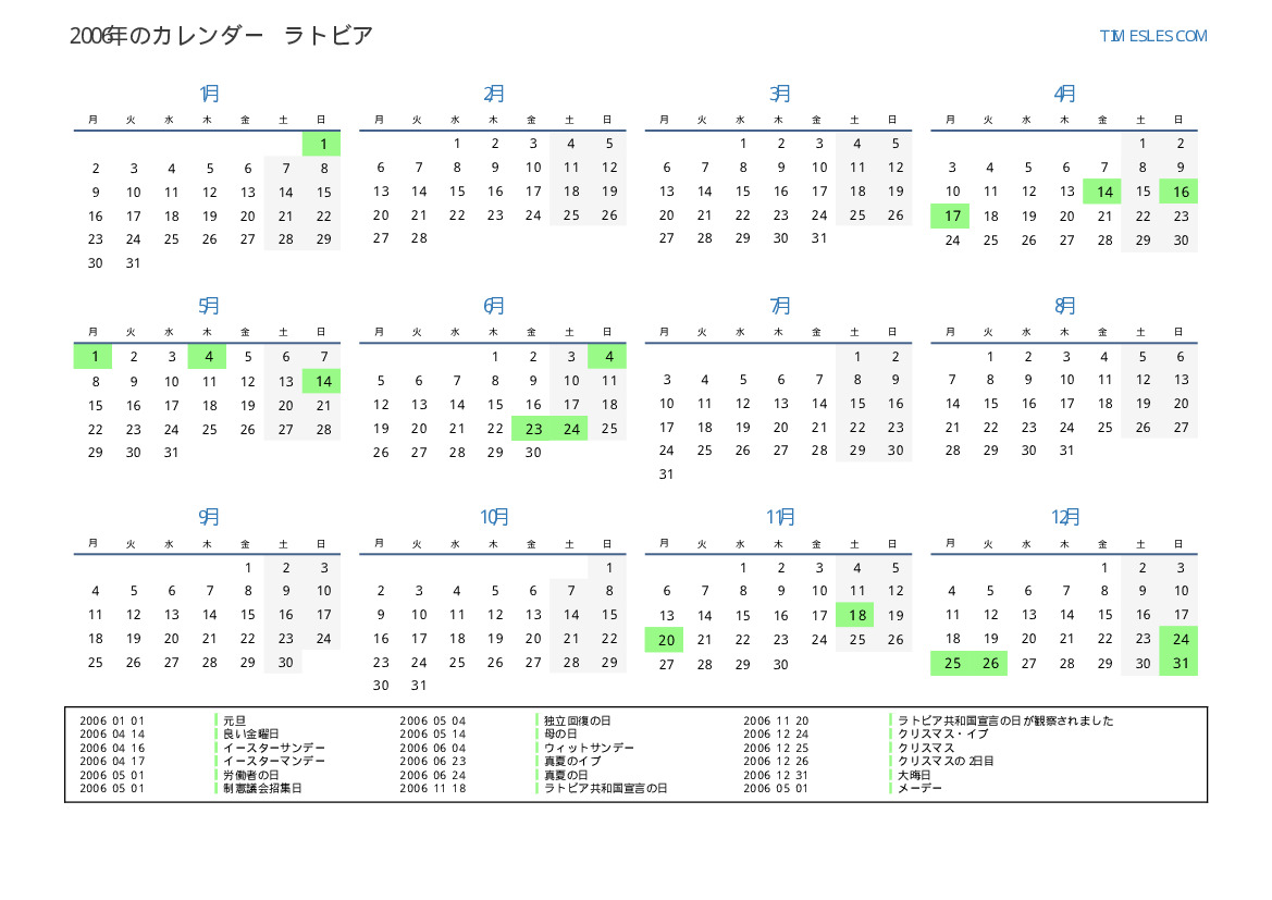 ラトビア向け2006年の休日と週末を含むPDFカレンダーをダウンロードして印刷します