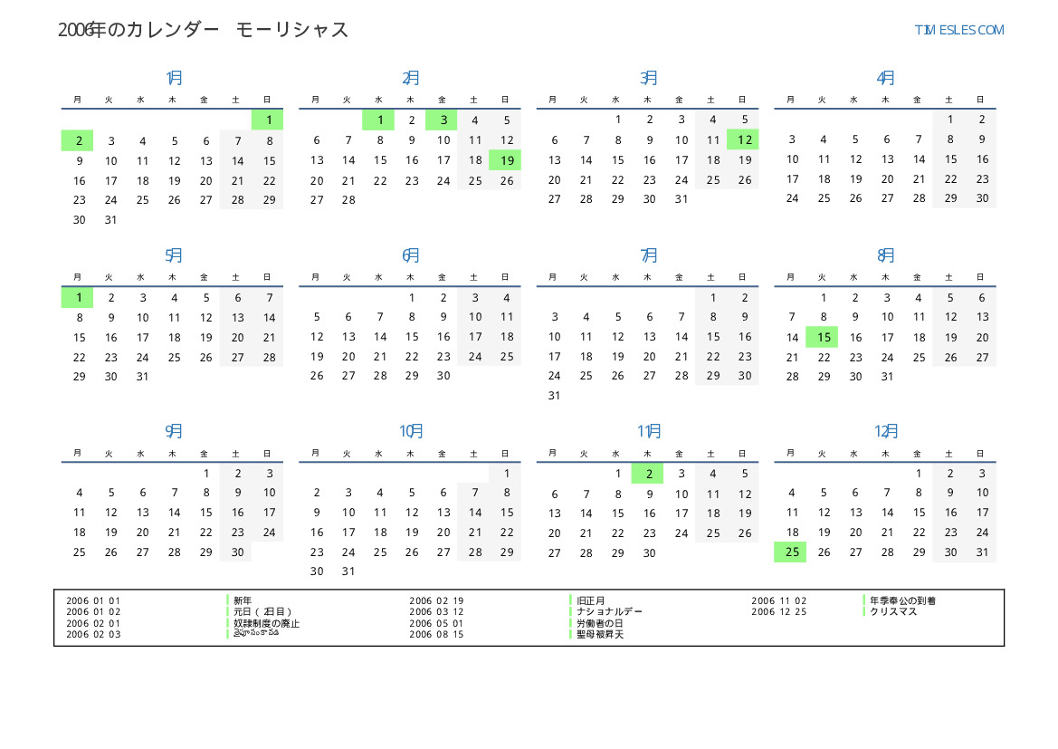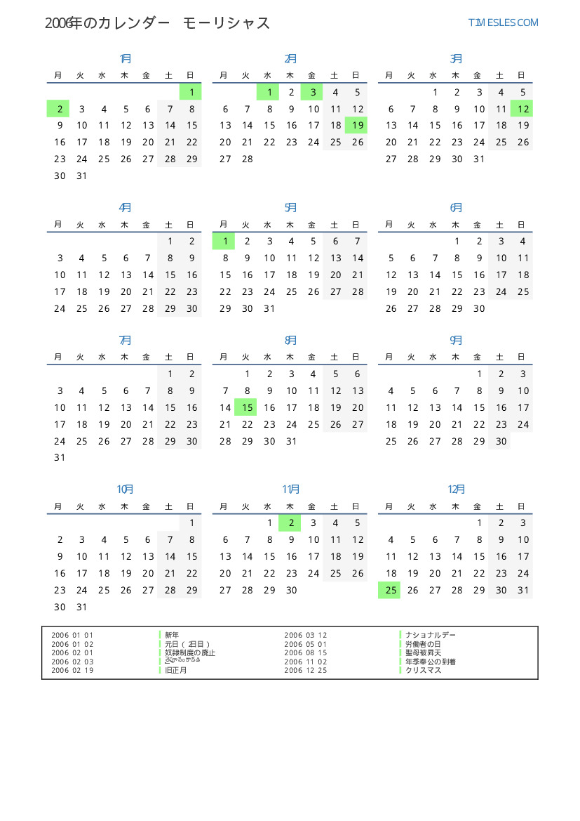 モーリシャスのためにの2006年の休日と週末のカレンダー