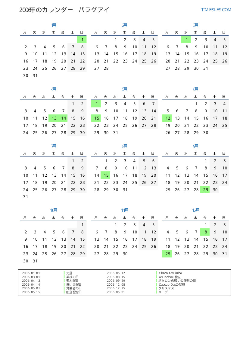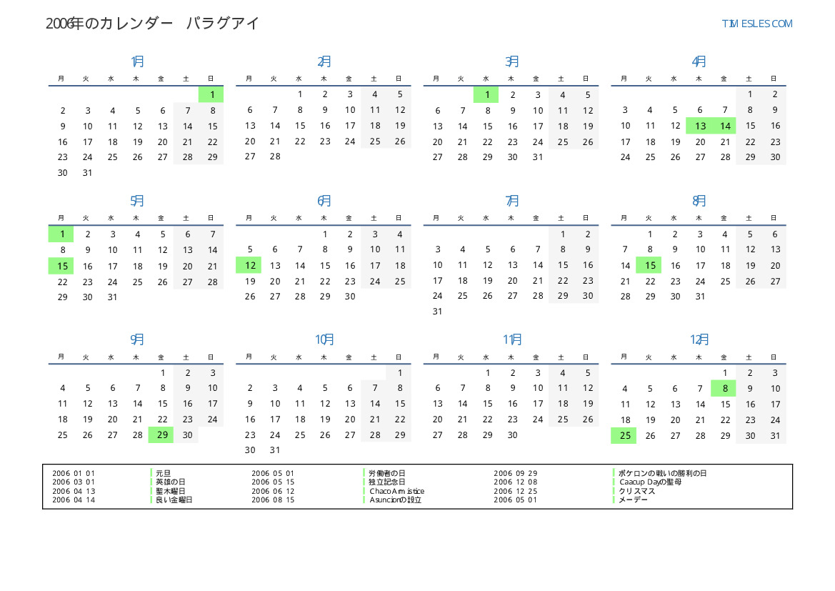 パラグアイ向けの2006年の休日と週末のカレンダー