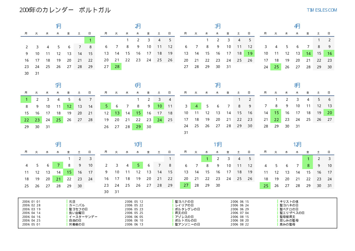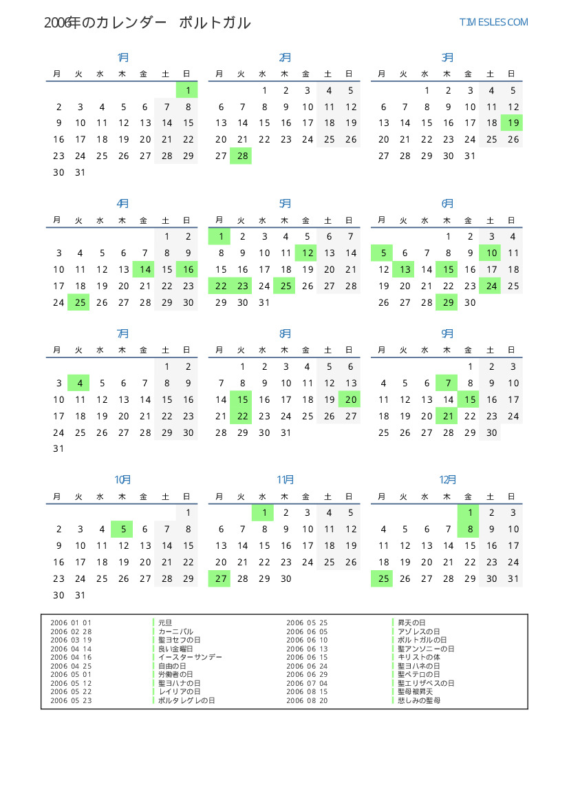 ポルトガル向けの2006年の休日と週末のカレンダー